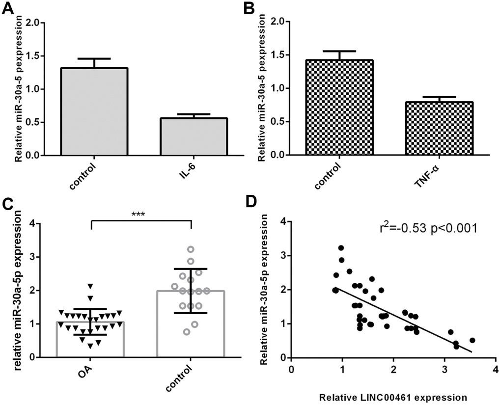 We then demonstrated that IL-6 inhibited the expression of miR-30a-5p in chondrocytes (Figure 3A). We showed that TNF-α suppressed miR-30a-5p expression in chondrocytes (Figure 3B). In addition, we found that miR-30a-5p expression was lower in OA tissues than in normal samples (Figure 3C, ***p<0.001). The expression level of miR-30a-5p in OA tissues was negatively correlated with LINC00461 expression (Figure 3D).