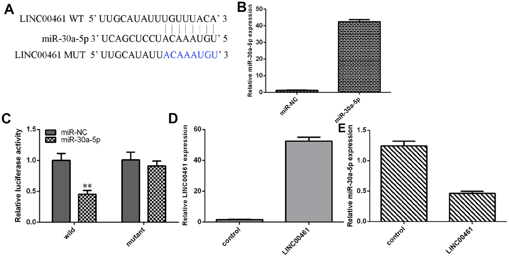 As shown in Figure 4A, complementary binding sites were found in the 3′-UTR (untranslated region) between LINC00461 and miR-30a-5p by using starBase (http://starbase.sysu.edu.cn/index.php). We confirmed that the expression of miR-30a-5p was upregulated in chondrocytes treated with miR-30a-5p mimics (Figure 4B). In addition, we showed that overexpression of miR-30a-5p decreased the luciferase activity of WT-LINC00461 (wild type) but not Mut-LINC00461 (Figure 4C, **p<0.01). We also found that the expression of LINC00461 was upregulated in chondrocytes treated with pcDNA-LINC00461 (Figure 4D). Elevated expression of LINC00461 suppressed the expression of miR-30a-5p in chondrocytes (Figure 4E).