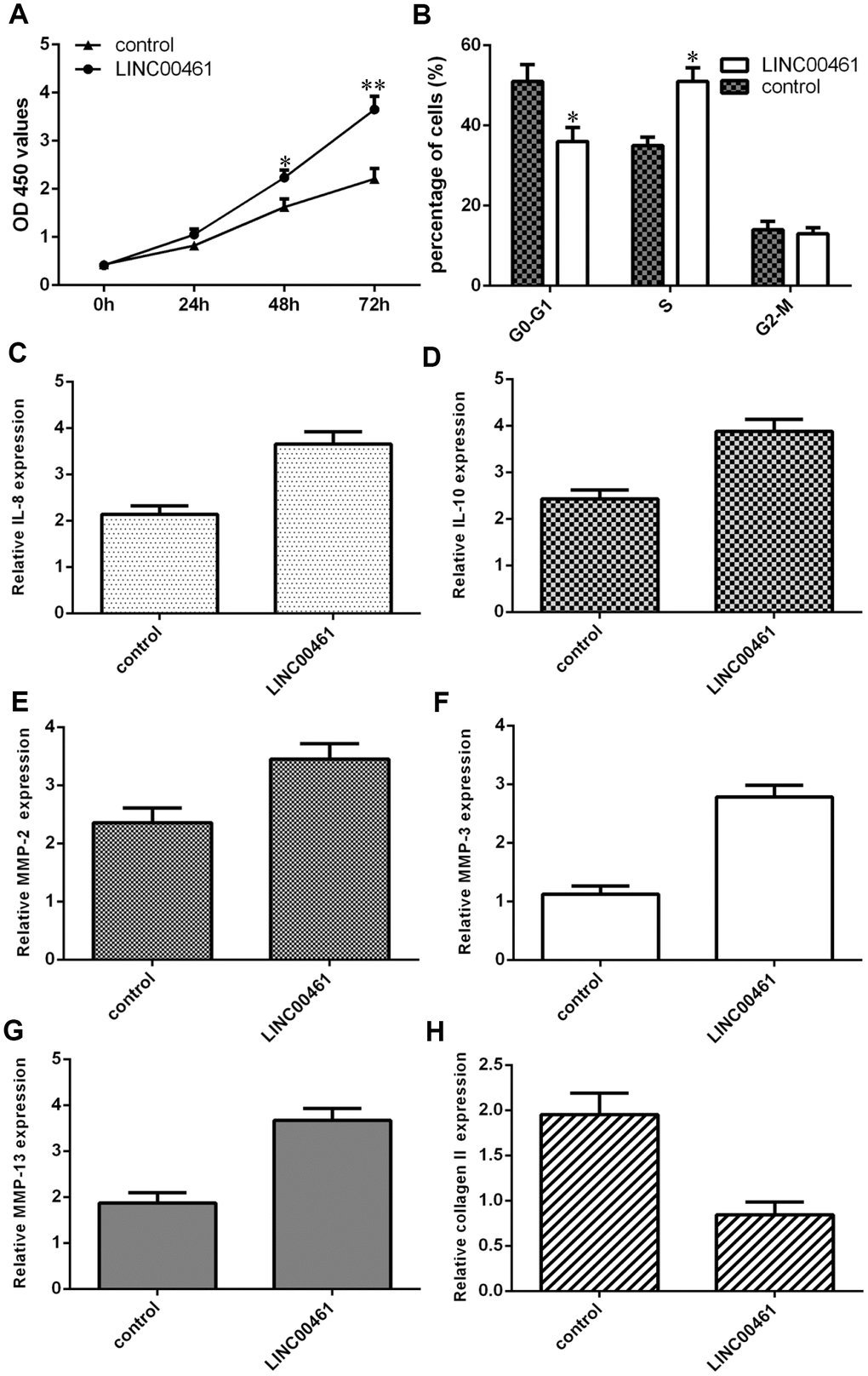 Next, we showed that overexpression of LINC00461 significantly enhanced cell proliferation in chondrocytes (Figure 5A). We also demonstrated that elevated expression of LINC00461 increased cell cycle progression in chondrocytes (Figure 5B). Interestingly, we found that IL-6 expression was upregulated in chondrocytes after LINC00461 treatment (Figure 5C). Moreover, we showed that LINC00461 overexpression enhanced IL-10 expression in chondrocytes (Figure 5D). Ectopic expression of LINC00461 promoted MMP-2 expression in chondrocytes (Figure 5E). The expression level of MMP-3 was increased in chondrocytes after LINC00461 treatment (Figure 5F). Furthermore, we showed that elevated expression of LINC00461 enhanced MMP-13 expression (Figure 5G) and decreased type II collagen expression (Figure 5H) in chondrocytes.