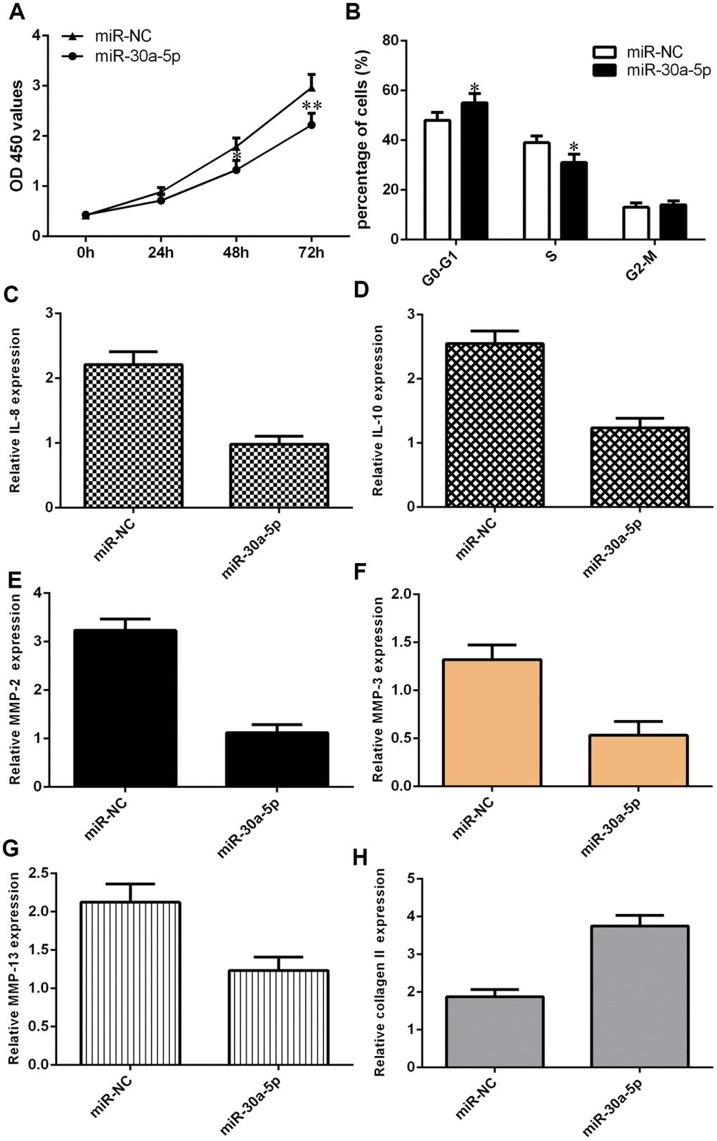We showed that overexpression of miR-30a-5p significantly decreased cell proliferation in chondrocytes (Figure 6A). We also demonstrated that elevated expression of miR-30a-5p suppressed the cell cycle in chondrocytes (Figure 6B). Interestingly, we found that IL-6 expression was downregulated in chondrocytes after miR-30a-5p treatment (Figure 6C). Moreover, we showed that miR-30a-5p overexpression inhibited IL-10 expression in chondrocytes (Figure 6D). Ectopic expression of miR-30a-5p decreased MMP-2 expression in chondrocytes (Figure 6E). The expression level of MMP-3 was decreased in chondrocytes after miR-30a-5p treatment (Figure 6F). Furthermore, we showed that elevated expression of miR-30a-5p suppressed MMP-13 expression (Figure 6G) and enhanced type II collagen expression (Figure 6H) in chondrocytes.