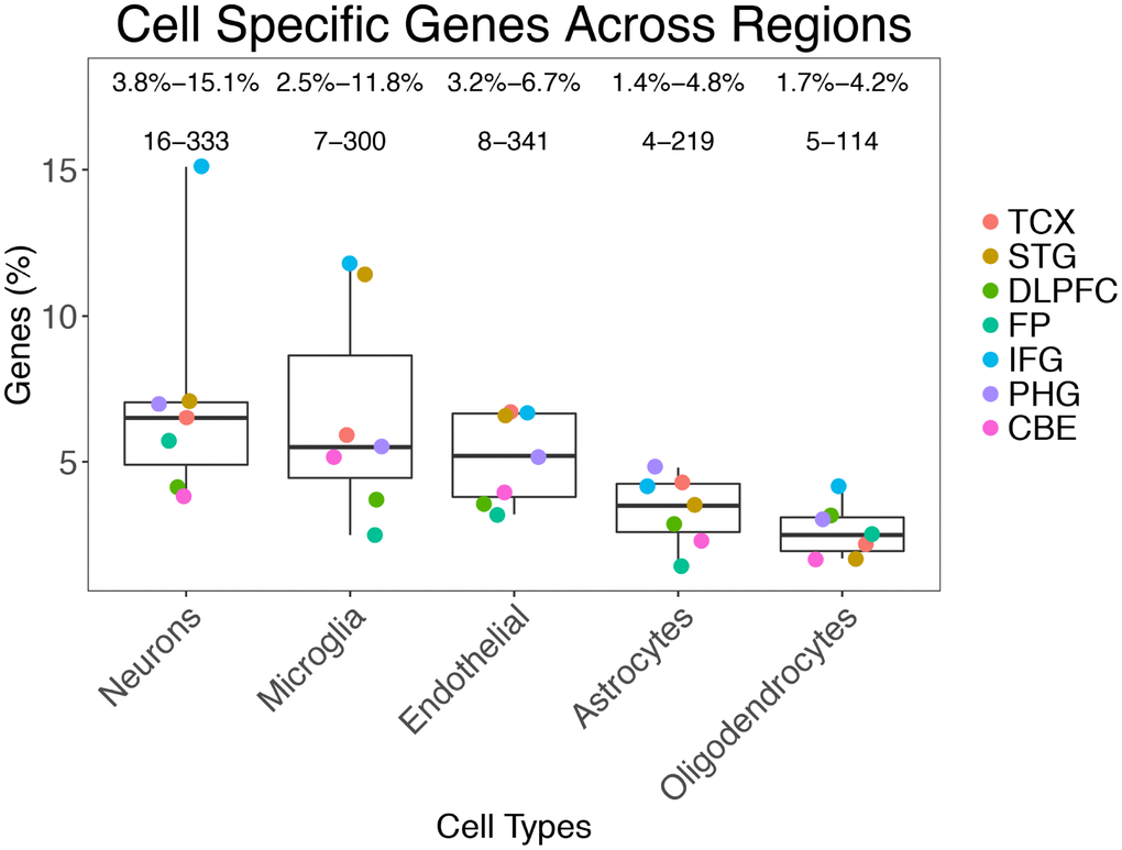 | Cell | TCX (5,514) | STG (594) | DLPFC (1,363) | FP (282) | IFG (119) | PHG (4,123) | CBE (4,211) |