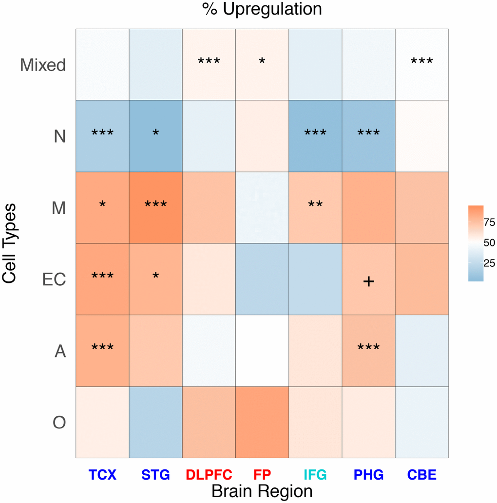 Table 1. Percentage of upregulation (% of genes with log2 FC > 0 and FDR < 0.05) for each brain region and cell type. In brackets, the number of DEGs classified is reported.