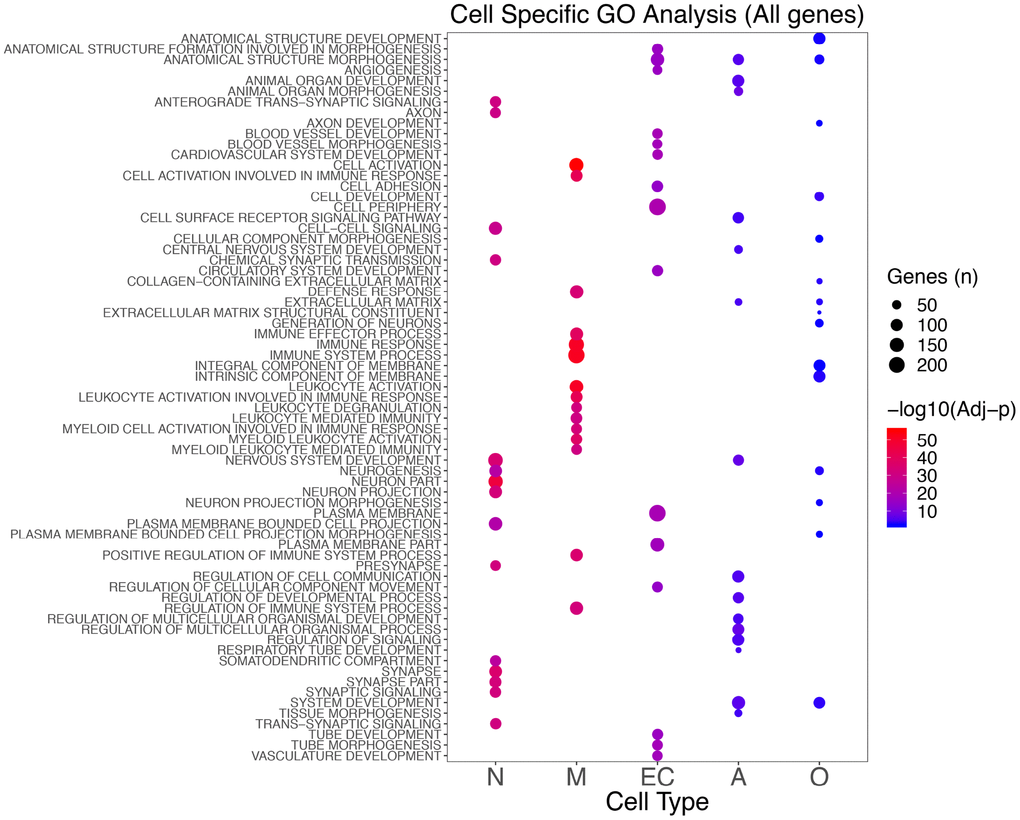 Using Gene Ontology (GO), we identified significantly enriched processes for each cell type (Supplementary Table 3A–3C; Supplementary Figure 5). Genes showing the most specific functional classes were neurons (synaptic and neuronal), endothelial (vascular and angiogenesis), and microglia (immune system). Astrocyte genes were enriched in developmental processes and cell-cell signaling, whereas oligodendrocytes were enriched for developmental and neurogenesis processes (Figure 3).