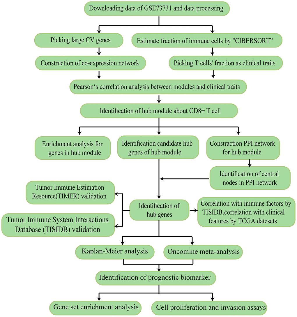 With the rapid development of bioinformatics technology, many tools have been developed to find biomarkers [16]. Weighted gene co-expression network analysis (WGCNA) is an effective tool that can be used to mine related patterns between genes to identify relevant modules and hub genes for cancer [17]. This algorithm has been widely used to find biomarkers at the transcriptional level [18, 19]. Cell-type Identification by Estimating Relative Subsets of RNA Transcripts (CIBERSORT) is another bioinformatics tool for analysis of gene expression data. This tool quantifies the cellular composition of immune cells using a deconvolution algorithm [20]. This algorithm has been successfully used to approximate the level of immune cell infiltration in various cancers, such as prostate cancer [21] and kidney cancer [8].