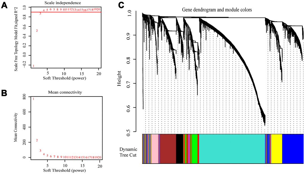 The expression values of the 4411 genes were used to construct a co-expression network using the R package “WGCNA” We calculated average linkage and Pearson’s correlation values to cluster the samples of GSE73731 (Supplementary Figure 1). To build a scale-free network, we picked β = 3 (scale free R2 = 0.8723676) as the soft-thresholding power (Figure 2A, 2B). A hierarchical clustering tree was constructed using dynamic hybrid cutting. Each leaf on the tree represents a single gene, and genes with similar expression data are close together and form a branch of the tree, representing a gene module. Nine modules were generated (Figure 2C).