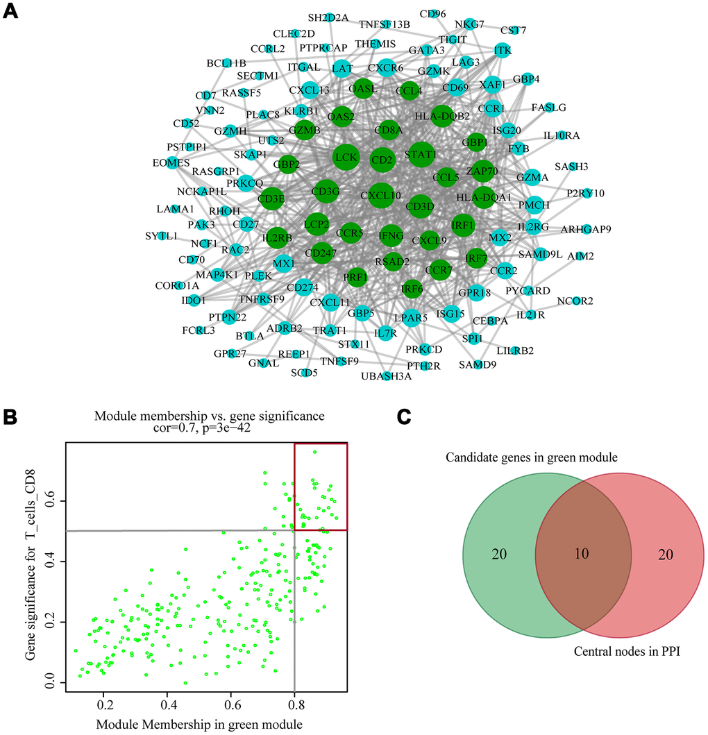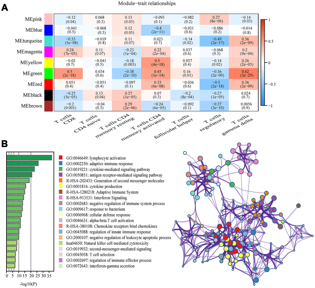 Among the nine module, the green module was highly correlated to T cells CD8 (CD8+ T cells) (R2=0.5, P=2e-18), T cells CD4 memory activated (R2=0.45, P=1e-14), and T cells gamma delta (R2=0.62, P =3e-29), and the yellow module showed higher correlation with activated T cells CD4 memory activated (R2=0.5, P=4e-18; Figure 3A). The correlation between other modules and T cells was less than 0.5. We were interested specifically in the CD8+ T cells, so focused on the green module that showed correlation with CD8+ T cells was identified as a hub module. Genes included in this module were next analyzed using the web tool “Matascape” for pathway and process enrichment analysis. The 20 highest enrichment terms were all immune-related terms (Figure 3B), and the three most highly enriched terms were Lymphocyte Activation, Adaptive Immune Response, and Cytokine-mediated Signaling Pathway (Supplementary Table 3).