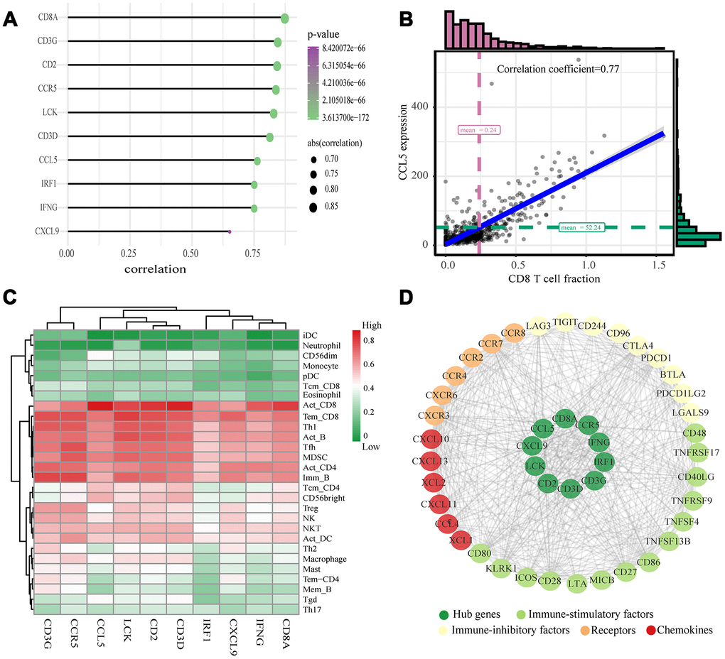 The highly connected genes of the module were investigated as potential key factors related to CD8+ T cell infiltration level. According to the cut-off standard (Module-Membership > 0.8 and Gene-Significance > 0.5), 30 genes were selected as candidate hub genes (Figure 4B). From the protein-protein interactions (PPI) network, cut-offs of reliability > 0.7 and connectivity > 15 (node/edge) were applied to identify 30 genes as central nodes, and we visualized these results using Cytoscape (Figure 4A). Ten genes were selected in both analyses designated as hub genes (LCK, CD2, CD3D, CD3G, IRF1, IFNG, CCR5, CD8A, CCL5 and CXCL9) (Figure 4C). To investigate the relationship between these hub genes and CD8+ T cells, we analyzed the expression data for these genes in the TIMER database. The results showed positive correlation of the expression values of the 10 genes with the infiltration levels of CD8+ T cells (correlation coefficient of at least 0.75 for all genes except CXCL9) (Figure 5A). As an example, we show a scatter plot of CCL5 expression and CD8+ T cell infiltration level in Figure 5B. We next queried the TISIDB database to obtain the Spearman correlation values between abundance of tumor-infiltrating lymphocytes and gene expression. The results show a positive correlation between hub genes and tumor-infiltrating lymphocytes. The correlation values were highest for Activated CD8+ T cell (Act CD8) and Effector memory CD8+ T cell (Tem CD8) (Figure 5C). These analyses verified the identified hub genes as strongly associated with the CD8+ T cell infiltration level and playing significant roles in the immune microenvironment.