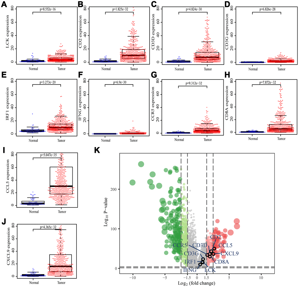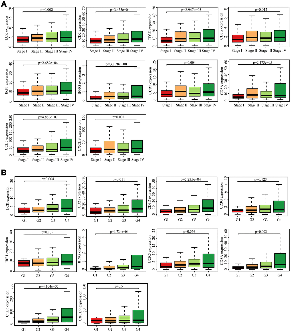 We searched for the Spearman correlations of expression of these 10 hub genes with the expression of immune factors in TISIDB database, including immune-inhibitory factors, immune-stimulatory factors, chemokines, and receptors. These correlations are presented as heat maps (Supplementary Figure 2). We identified 38 immune-related factors with average correlations with the 10 hub genes greater than 0.5. We constructed an immune infiltration interaction network based on the 10 hub genes and the 38 immune-related factors to explore the infiltration mechanism of CD8+ T cells using the STRING database. The results were imported into Cytoscape for visualization (Figure 5D). We next obtained the expression levels of the 10 genes of ccRCC from the The Cancer Genome Atlas (TCGA). The expression levels of these genes were higher in tumor tissues than in normal tissues (P < 0.05) based on Wilcoxon signed-rank test (Figure 6A–6J). Volcanic map also showed that the expression of 10 genes in tumor tissues was higher than that in normal tissues (Figure 6K), with corrected p values of all genes less than 0.05, indicating statistical significance. The fold changes of CCL5 and CXCL9 were more than 2.5-fold higher in tumor tissues than the levels in normal tissues (Supplementary Table 4). The relationships between hub genes and pathological stages are shown by boxplot (Figure 7A). Expression levels of all hub genes show significant differences in pathological stages (p < 0.05) and showed an upward trend with increased stages. Finally, we investigated the connection between tumor grades and hub genes (Figure 7B), in which LCK, CD2, CD3D, IFNG, CD8A, and CCL5 showed significant correlation with different tumor grades (p < 0.05), with grade increase corresponding to increased gene expression. Although no significant difference was detected for CD3G, IRF1, CCR5, and CXCL9, the gene expression level showed an upward trend with increased tumor grades.