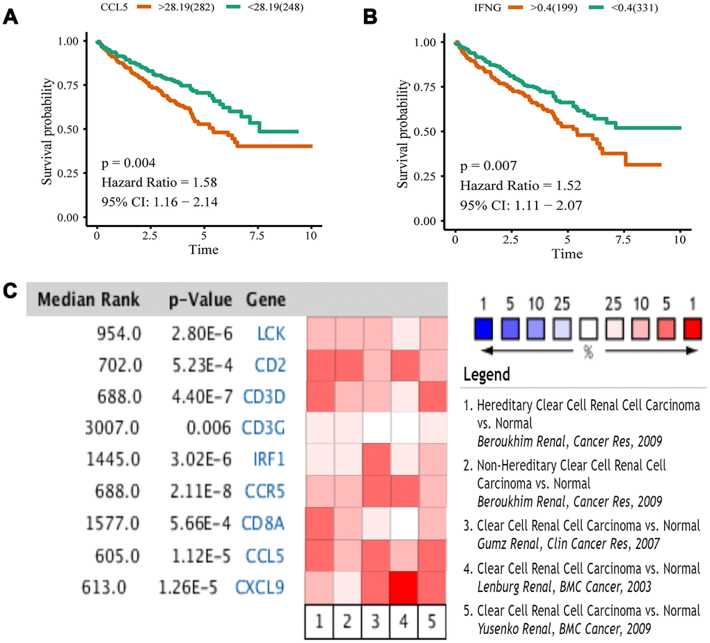 We analyzed 10 hub genes by Kaplan-Meier analysis, and only the results of CCL5 and IFNG were statistically significant (p < 0.05). For these two genes, the survival prognosis of patients with high expression was poor (Figure 8A, 8B). To validate differential expression of 10 genes in tumor and normal tissues, we used Oncomine to perform a meta-analysis of five analyses using four data sets, all of which included both tumor tissues and normal controls for 10 genes (Figure 8C). Data for IFNG were not included in these data sets, so we obtained meta-analytical results for the other nine genes. LCK, CD2, CD3D, CCR5, CCL5, and CXCL9 have Median Rank values less than 1000, CD3G is 3007.0, IRF1 is 1445.0, and CD8A is 1577.0. The results show these genes exhibit significant overexpression in tumor tissues which was consistent with the TCGA datasets analyses. Through Kaplan-Meier and Oncomine meta-analysis, we selected CCL5 as a prognostic biomarker for further analysis.