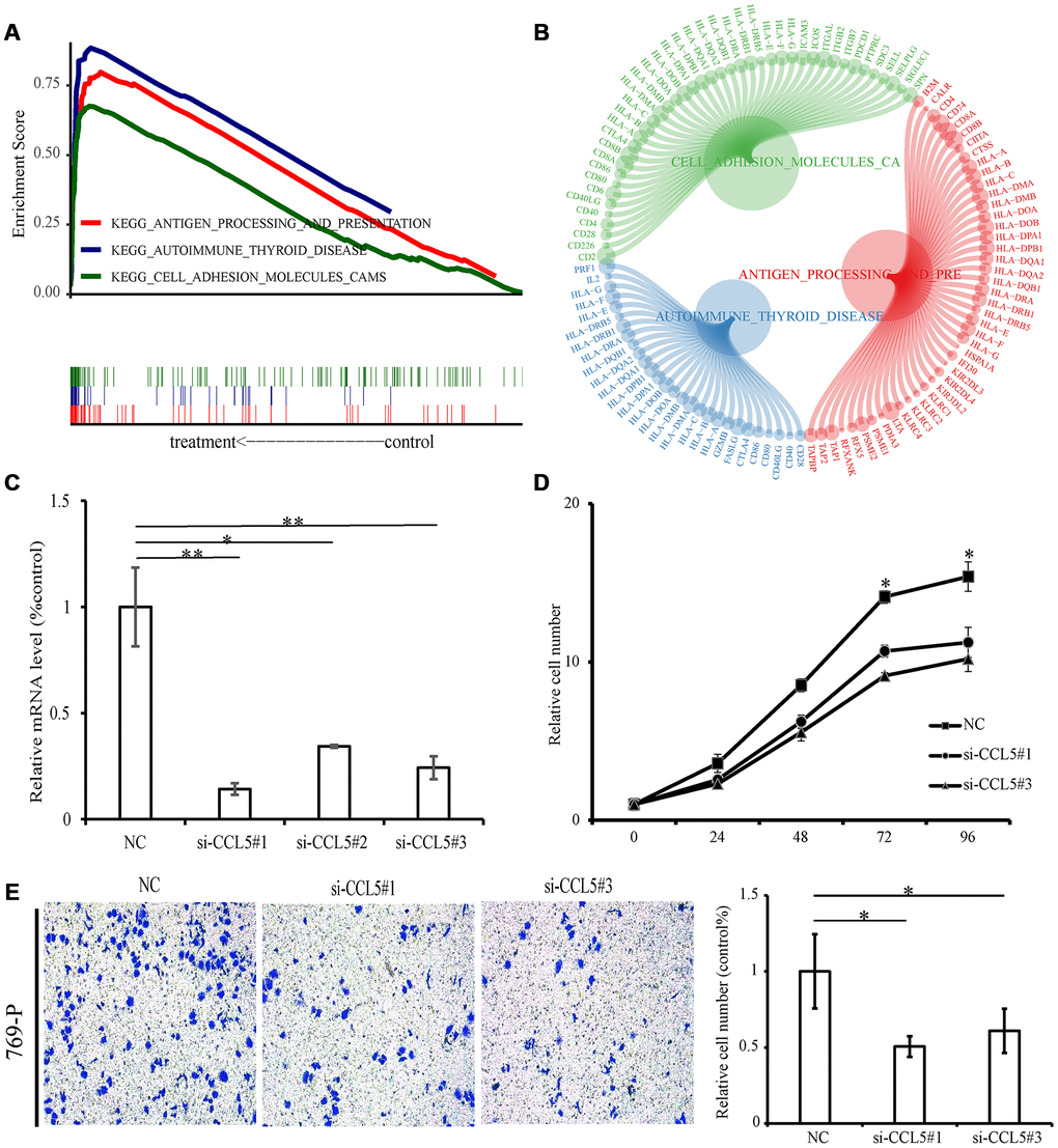 Because CCL5 is overexpressed in ccRCC and is related to poor prognosis, we next conducted functional experiments to explore the potential biological function of CCL5. First of all, we used small interfering RNAs to lower expression levels of CCL5 in the renal cell carcinoma cell line 769-P (Figure 9C) and evaluated the cell proliferation ability by Cell Counting Kit-8 (CCK-8). The results showed decreased cell line proliferation ability after CCL5 knockdown (Figure 9D). Finally, the invasion ability of the cell line decreased significantly after CCL5 knockdown (Figure 9E).