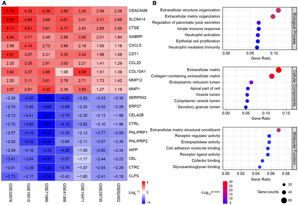 After seven cases were excluded from these datasets, the data of 177 normal pancreatic tissue samples and 226 PDAC tissue samples were included in subsequent analyses. A robust rank aggregation analysis [24] identified 616 differentially expressed genes (DEGs) between the normal and PDAC samples across all datasets, with an adjusted p value < 0.05 and |log2FC (fold change)| > 1 as the cut-offs. Among these genes, 403 were upregulated and 213 were downregulated in PDAC tissues. The heatmap displaying the top 10 significantly overexpressed or suppressed genes is shown in Figure 1A.