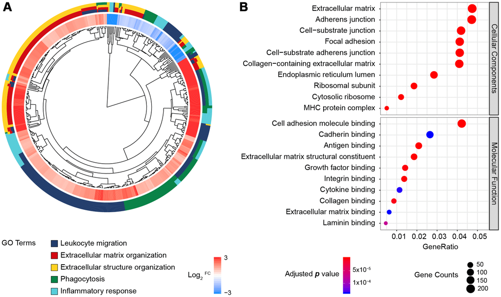 In total, 171 normal and 178 pancreatic cancer samples were analyzed, and 5,886 DEGs were identified by the same cut-off criteria used to analyze the PDAC microarrays (|log2FC| > 1 and false discovery rate < 0.05). Among these genes, 2,980 were upregulated and 2,906 were downregulated in pancreatic cancer tissues relative to normal pancreatic tissues. These DEGs were enriched in 600 BP, 106 CC and 32 MF terms, and the most significantly enriched BP terms were related to leukocyte function, extracellular matrix formation, inflammation, etc. (Figure 2A). Consistent with the DEGs in the microarrays, most of the genes were enriched in the extracellular matrix or junctions for adhesion and antigen-binding functions (Figure 2B). Thus, both sequencing and multi-microarray data indicated that the tumor immune and stroma microenvironment was significantly disturbed during pancreatic tumorigenesis.