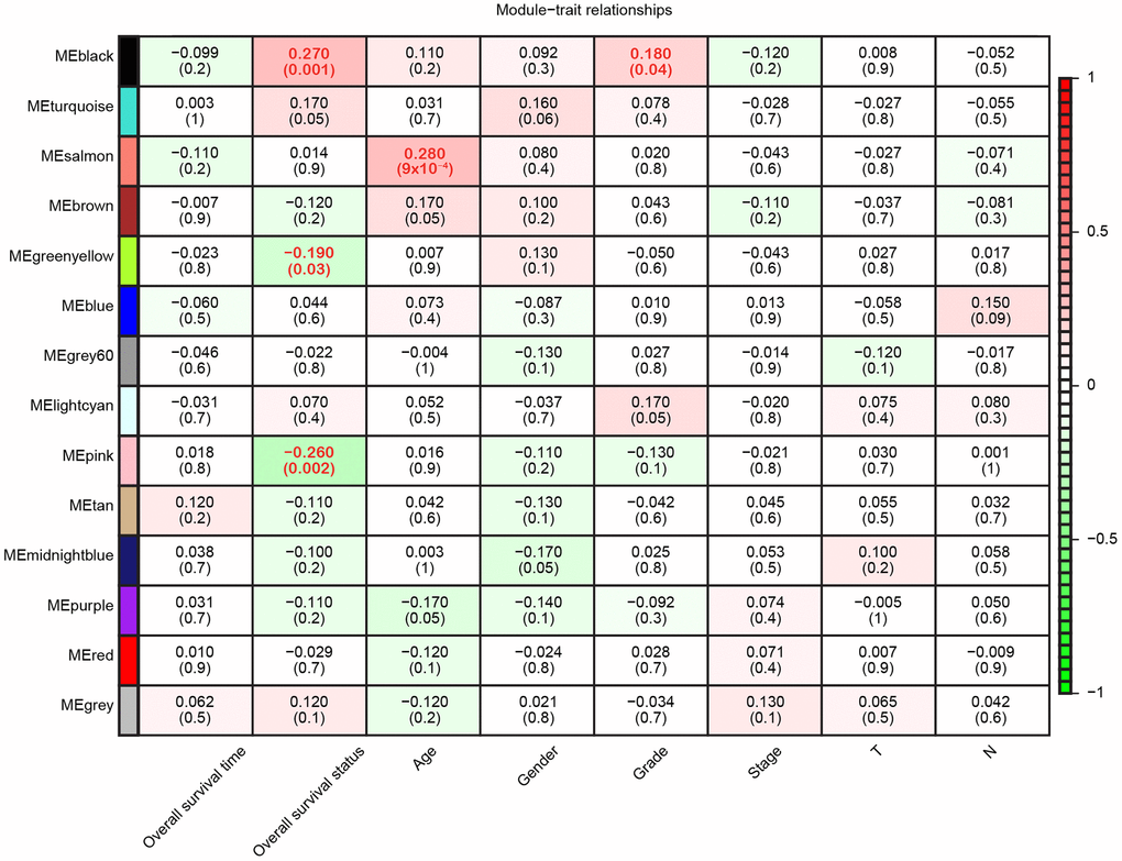 Since we had already identified the characteristic gene co-expression profiles of each module, we searched for significant correlations between the module eigengenes and clinical traits. Overall survival status was associated with three modules, although the Pearson correlations were weak; for example, the black module correlated positively (r = 0.27, p = 0.001) and the pink module correlated negatively with overall survival (r = -0.26, p = 0.002) (Figure 3). Additionally, age and tumor grade were associated with one module each, while the other four clinical traits we examined (gender, tumor stage, T classification and N classification) were not associated with any module. Thus, WGCNA analysis indicated that overall survival was the main clinical trait associated with the pancreatic cancer profiles in TCGA, so we focused on overall survival in our subsequent investigations.