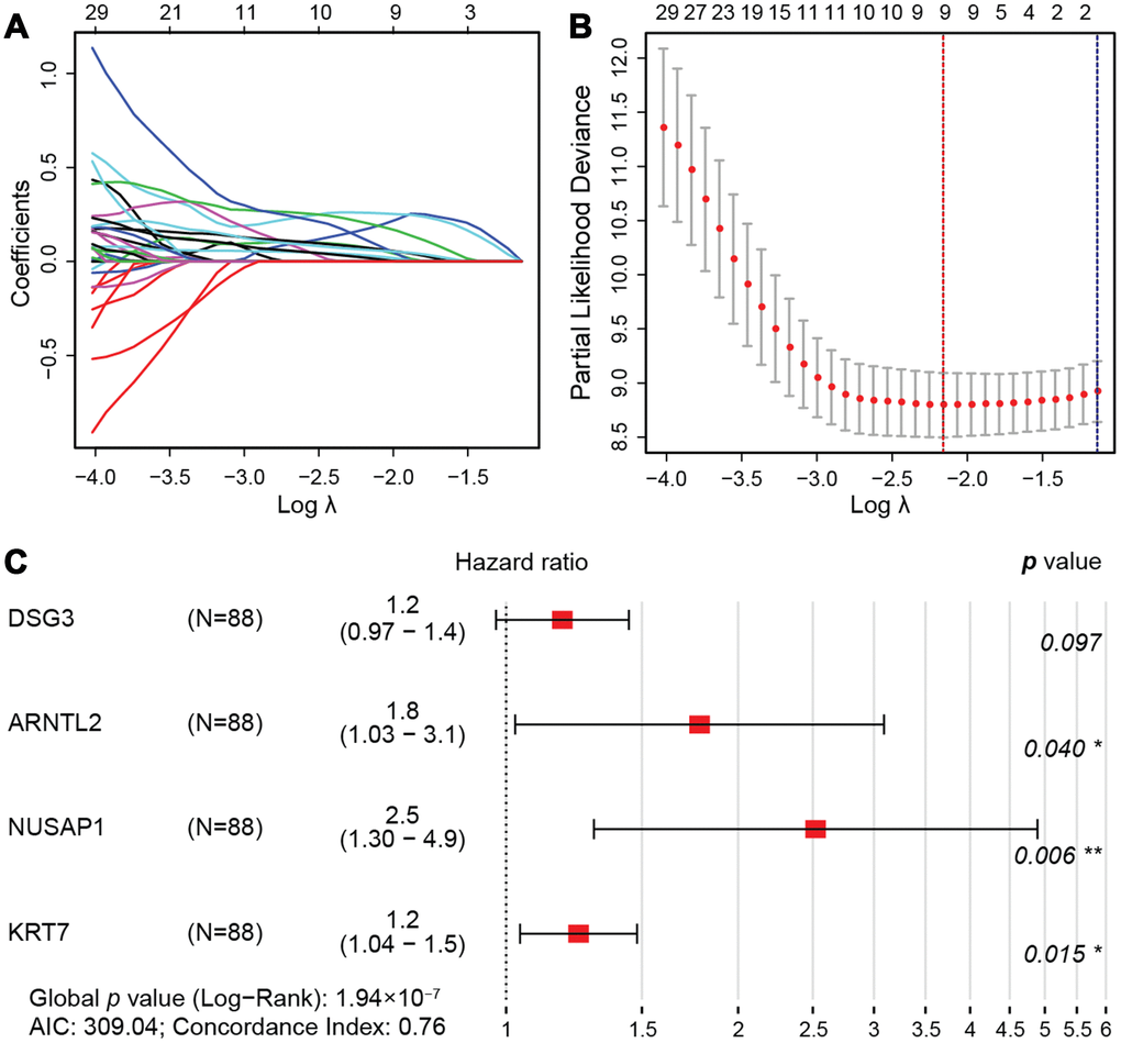 A least absolute shrinkage and selection operator (LASSO) regression model [34] was then used to select key prognosis-associated genes. In the LASSO-penalized Cox regression, as log λ (a tuning parameter) changed, the corresponding coefficients of certain genes were reduced to zero, indicating that their effects on the model could be omitted because they were shrinking parameters (Figure 5A). Following cross-validation, nine genes achieved the minimum partial likelihood deviance (Figure 5B). Moreover, at this point, log λ was approximately -2.16, and the nine genes displayed non-zero effects, all contributing positive HRs to the model. The nine genes that were thus fit into the Cox model were PBK, which encodes MAPKK-like protein kinase; DLGAP5, which encodes a mitotic phosphoprotein; RACGAP1, also called Rac GTPase activating protein 1; DSG3, also called cadherin family member 6; ARNTL2, which functions as a TF; NUSAP1, also called nucleolar and spindle associated protein 1; DKK1, also called Dickkopf WNT signaling pathway inhibitor 1; KRT7, which encodes a cytokeratin; and C15orf48, a protein-coding gene that is also called chromosome 15 open reading frame 48.