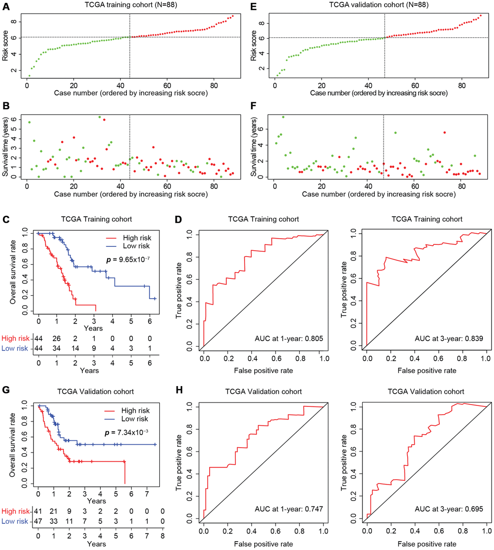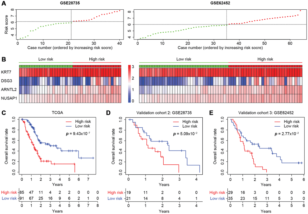 Then, we randomly divided the 176 pancreatic cancer patients in TCGA (two cases in the enrolled TCGA pancreatic cancer cohort (N=178) were excluded due to insufficient follow-up data) into a training cohort (N = 88) for the construction of a prognostic model, and a validation cohort (N = 88) for internal self-validation (Table 4). Multivariate Cox regression analysis of the training cohort indicated that ARNTL2, NUSAP1, DSG3 and KRT7 were independent prognostic factors (Figure 5C). The prognostic risk score was calculated as: expression of DSG3 × 0.17 + expression of ARNTL2 × 0.58 + expression of NUSAP1 × 0.92 + expression of KRT7 × 0.22, where the numbers indicate the respective multivariate Cox regression coefficients.
