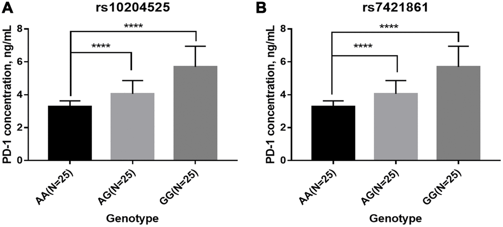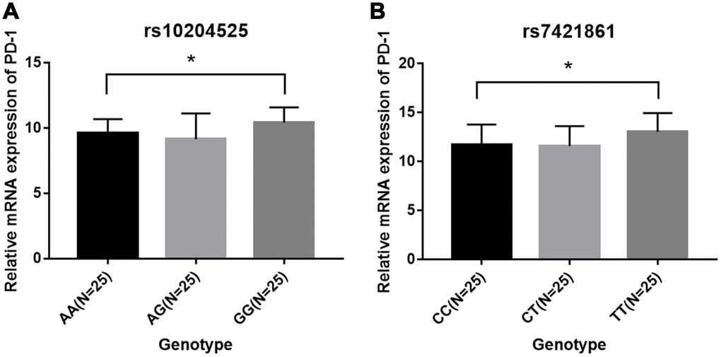 In summary, the rs7421861 and rs10204525 polymorphisms in PD-1 gene increase the risk of esophageal cancer in a Chinese Han population. These polymorphisms could be potential diagnostic and therapeutic biomarkers. However, the conclusions still need further validation by more studies with large sample sizes in other ethnicities.