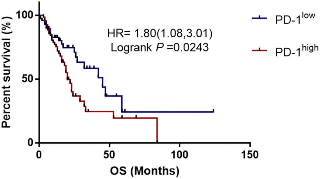 The prognostic value of PD-1 mRNA expression in ESCC was assessed using OncoLnc (http://www. oncolnc.org), which contains survival data for 144 patients derived from The Cancer Genome Atlas dataset. Hazard ratios and 95% CIs were obtained using a Cox proportional-hazards model.