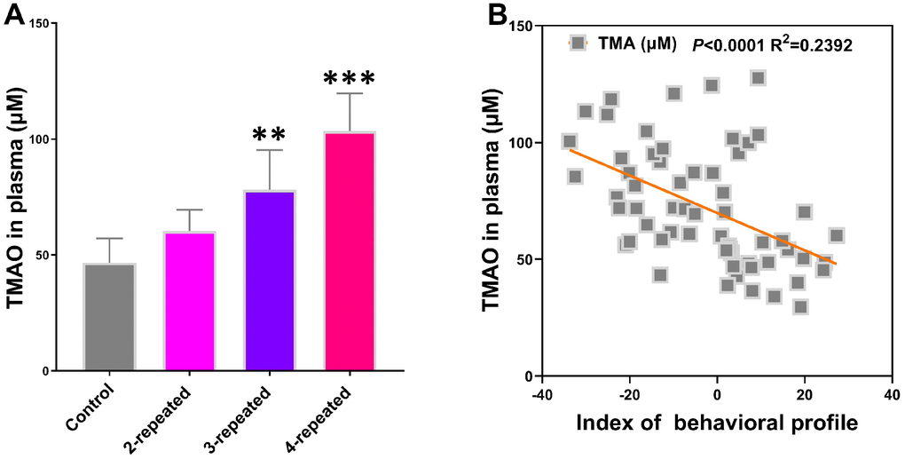 Liquid chromatography-tandem mass spectrometry (LC/MS) analysis showed that the plasma TMAO levels were significantly higher in the model group mice compared to the control group (Figure 2A). Furthermore, Spearman correlation analysis showed negative association between plasma TMAO levels and the behavioral as well as the electrophysiological characteristics (Figure 2B). These results demonstrate that elevated plasma TMAO levels correlate with behavioral and electrophysiological deficits in the model group mice.