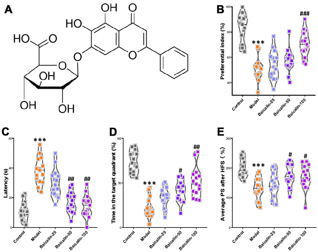 We then examined whether baicalin supplementation (Figure 3A) improves cognition, memory, and LTP declines in mice that underwent carotid occlusion thrice to induce cerebral ischemia-reperfusion (model group). After a 7-day baicalin treatment following ischemia-reperfusion, object recognition test results showed significantly lower preferential index in the 100 mg/kg baicalin-treated model group mice after 1h training compared to the model group mice (Figure 3B). Morris water maze test results showed significantly longer escape latencies in the model group mice compared to the control group mice and the baicalin-treated model group mice (Figure 3C). The time in the target quadrant was significantly shorter for the model group mice compared to the control group, and the baicalin-treated model group mice (Figure 3D). The number of plate crossings and swimming speed (data not shown) were comparable for the mice belonging to the baicalin-treated model group, model group alone, and the control group. The LTP test results showed the average PS was significantly higher in the control, and baicalin-treated model group mice compared to the model group (Figure 3E). These findings show that oral treatment with baicalin ameliorates the decline in short-term object recognition memory, spatial learning and memory, and LTP, in response to repeated cerebral ischemia-reperfusion injury.