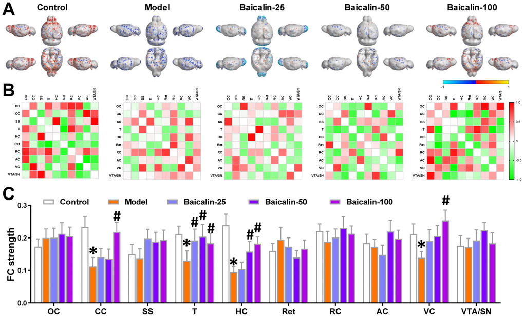 We then compared the brain regions of interest (ROI) based on the resting state-functional magnetic resonance imaging (rs-fMRI) results to evaluate the effects of baicalin treatment on the brain functional connectivity (FC). The ROIs were chosen based on the results of the rs-fMRI, and included orbitofrontal cortex (OC), cingulate cortex (CC), somatosensory cortex (SS), thalamus (T), hippocampus (HC), retrosplenial cortex (Ret), rhinal cortex (RC), auditory cortex (AC), the visual cortex (VC) and the ventral tegmental area/substantia nigra (VTA/SN). The functional connections between these ROIs are shown in the virtual graphs (Figure 4A) and correlation matrices (Figure 4B). The results show decreased FC in the cingulate cortex, thalamus, hippocampus, and visual cortex of model mice compared to the control mice (Figure 4C). The functional connectivity in the thalamus was significantly higher in the baicalin-treated model group mice for 3 different doses compared to the model group alone. FC in the hippocampus was significantly higher in the 50 and 100 mg/kg baicalin-treated model group compared to the model group. FC in the cingulate cortex and visual cortex was significantly higher in the 100 mg/kg baicalin-treated model group than the model group. These data indicate that baicalin improves FC in the brain regions of mice subjected to repeated cerebral ischemia-reperfusion. The effects were more pronounced for the model group mice treated with 100 mg/kg baicalin.
