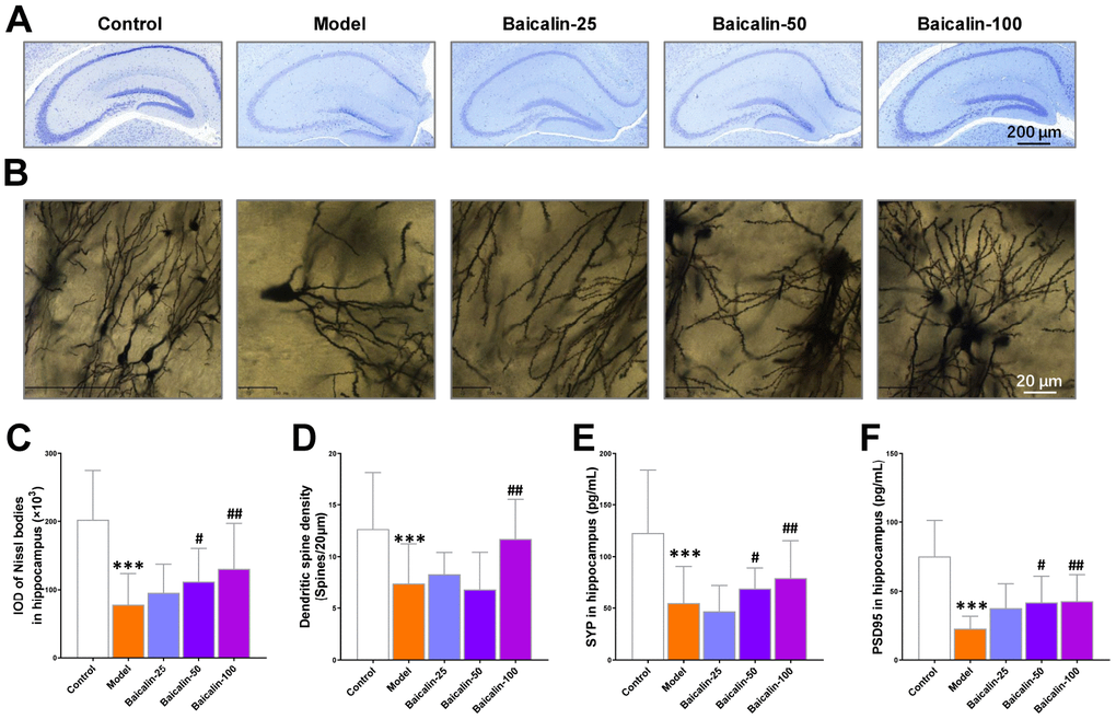 We performed Nissl and Golgi staining of brain sections to estimate Nissl bodies and dendritic spine density and determine the effects of baicalin on hippocampus neurons. Both Nissl and golgi staining showed neuropathological changes in the hippocampal region of the brain in the model group mice (Figure 5A and 5B). The model group mice showed significant reduction in the Nissl bodies in the hippocampal region compared to the control group (Figure 5C). Moreover, treatment with 50 and 100 mg/kg baicalin significantly increased the number of Nissl bodies in a dose-dependent manner in the model group mice (Figure 5C). Golgi staining analysis showed significant reduction in the dendritic spine density in the hippocampus of model group mice compared to the control group mice, but, treatment with 100 mg/kg baicalin significantly restored the dendritic spin density (Figure 5D). Immunohistochemical staining results showed that the levels of synaptic proteins, synaptophysin (SYP) and PSD95 were significantly reduced in the model group mice compared with the controls, but, their expression was significantly restored by treatment with 50 and 100 mg/kg baicalin (Figure 5E, 5F). These data demonstrate that baicalin significantly restores the hippocampal neuronal plasticity in mice subjected to repeated cerebral ischemia-reperfusion injury.