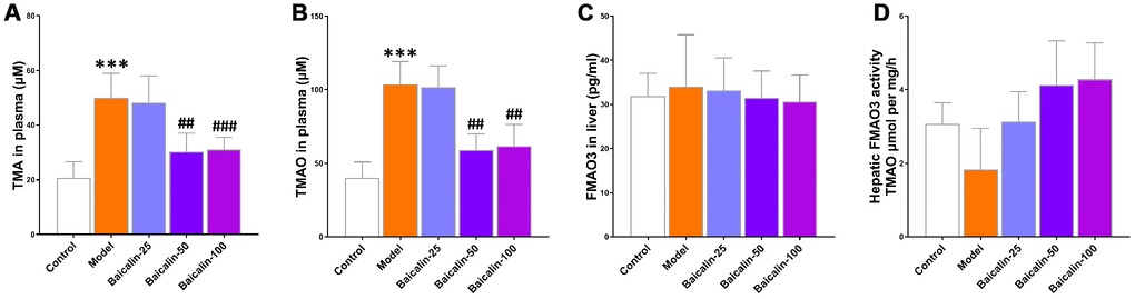 Next, we analyzed the effects of baicalin on the plasma levels and synthesis of TMA and TMAO. Our results show that 50 and 100 mg/kg baicalin administration significantly reduced the levels of TMA and TMAO, but, did not alter the levels of liver FMO3 protein and the activity of hepatic FMO (Figure 7). These results suggest that the gut microbes modulate the TMAO levels in response to repeated cerebral ischemia-reperfusion and baicalin treatments.