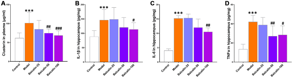 Previous studies show that elevated plasma levels of clusterin correlate with neuroinflammation in response to brain injury [17, 18]. The plasma clusterin levels were significantly higher in the model group mice compared with the control group, but, the levels were normalized in model group mice treated with 50 or 100 mg/kg baicalin (Figure 8A). Furthermore, neuroinflammation is associated with the brain-related pathology underlying cerebral ischemia-reperfusion. Clusterin is a biomarker for the immune response that follows cerebral ischemia-reperfusion [19]. Therefore, we evaluated the neuroinflammation status in the hippocampus and observed significantly higher levels of pro-inflammatory cytokines, IL-1β, IL-6, and TNF-α in the model group mice compared to the control group mice, but, the levels of these cytokines were restored to normal by treatment with 50 or 100 mg/kg baicalin (Figure 8B, 8D). This suggests that baicalin suppresses neuroinflammation in mice subjected to repeated cerebral ischemia-reperfusion.