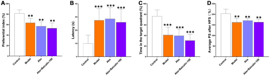 Next, we treated the model group mice with broad-spectrum antibiotics (Abs) with or without baicalin for 7 days to deplete the gut microbes. The model group mice treated with antibiotics showed significantly lower preferential index (Figure 9A), longer escape latencies (Figure 9B), shorter time in the target quadrant (Figure 9C) and decreased average PS (Figure 9D) compared to the untreated model group mice. We also observed that antibiotic treatment diminished the improvements in cognition and LTP shown by the bacialin-treated model group mice (Figure 9A–9D). These results demonstrate that baicalin induced remodeling of the gut microbiome is required to suppress pathological changes in brain functions, including cognition, memory, and LTP declines in mice subjected to repeated cerebral ischemia-reperfusion.