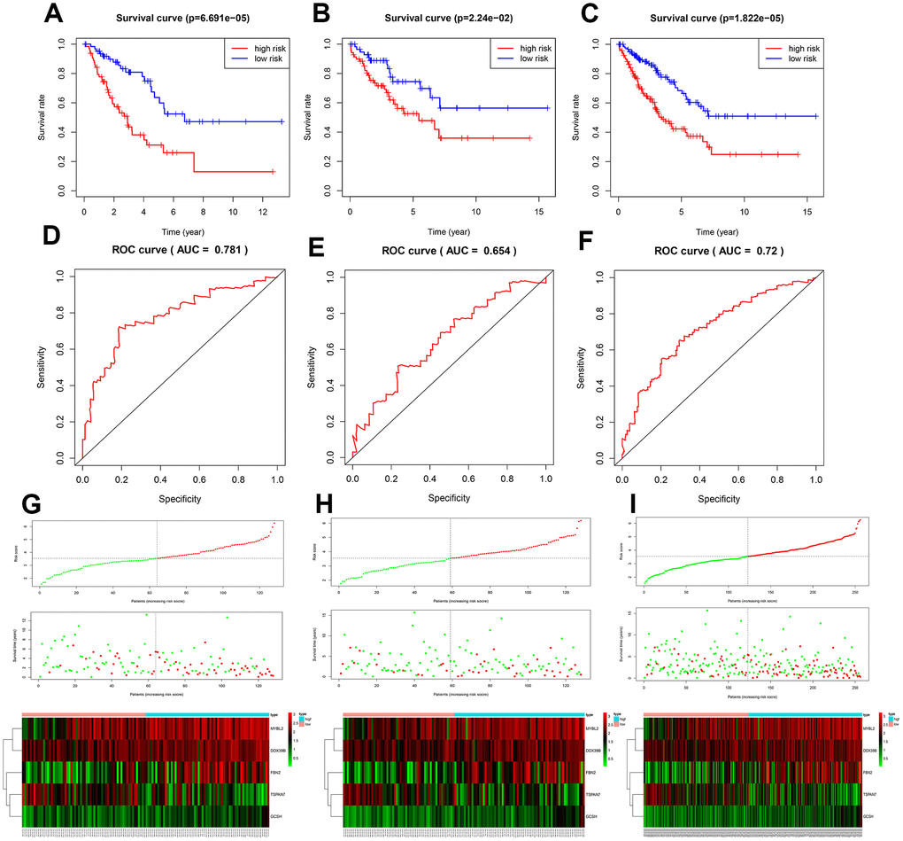 Among the five key genes, expression of MYBL2 and FBN2 was increased, and expression of TSPAN7, GCSH, and DDX39B was decreased, in STS patients (p<0.001; Supplementary Figure 3A and 3B). Expression levels of all of these key genes except DDX39B, which was not indexed in the external dataset (GSE21122), were validated in Supplementary Figure 3C. The five key genes effectively discriminated between STS patients and controls (Supplementary Figure 4). As shown in Supplementary Figure 5A and 5B, the five key genes could also distinguish between low- and high-risk patients and healthy individuals, further validating the accuracy of the prognostic model (p<0.001). Moreover, there were significant differences in expression of the five key genes between all histological types and controls (Supplementary Figure 6A and 6B). This result was also validated using the GSE21122 datasets (Supplementary Figure 6C), indicating these five key genes were suitable for predicting prognosis in all histological types included in this study.