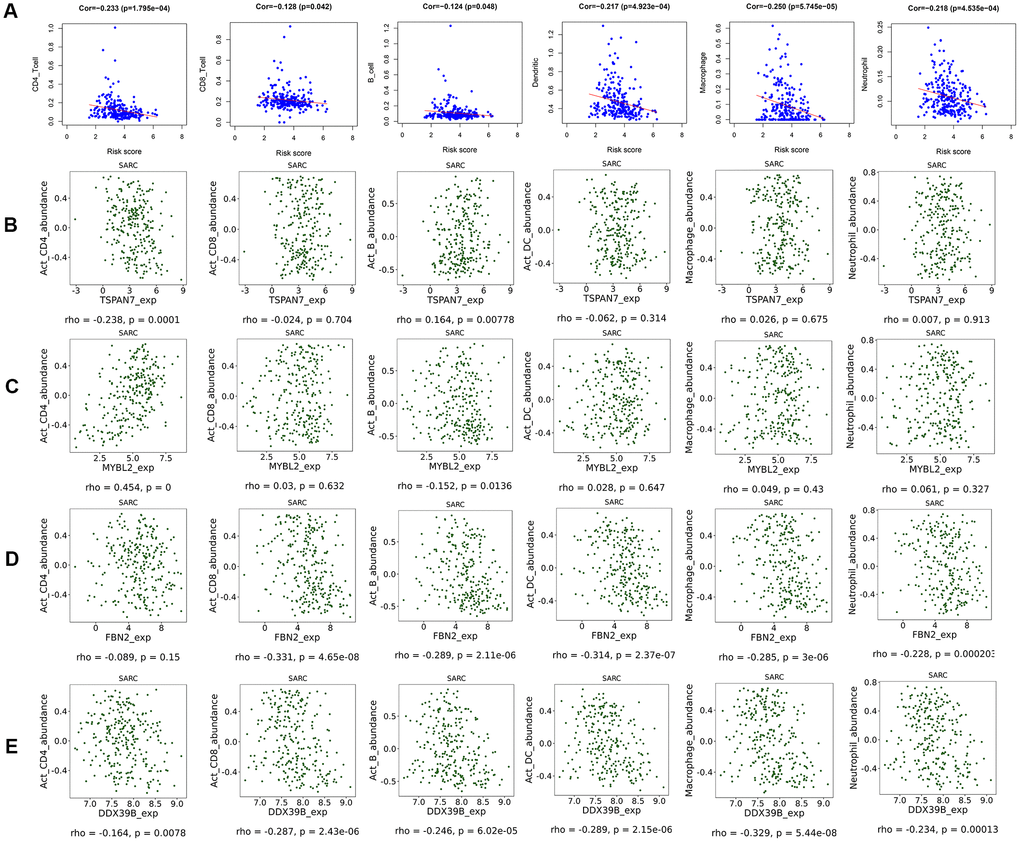 CD4+ T cell (correlation (cor)= -0.233, p=1.795e-04), CD8+ T cell (cor= -0.128, p=0.042), B cell (cor= -0.124, p=0.048), dendritic cell (cor= -0.217, p=4.923e-04), macrophage (cor= -0.250, p=5.745e-05), and neutrophil (cor= -0.218, p=4.535e-04) infiltration were negatively correlated with STS patient risk scores (Figure 5A). Similar negative correlations were observed between immune cells and FBN2 and DDX39B expression specifically (Figure 5D, 5E). TSPAN7 expression was negatively correlated with CD4+ T cell infiltration, but positively correlated with B-cell infiltration (Figure 5B). MYBL2 expression was positively correlated with CD4+ T cell infiltration, but negatively correlated with B-cell infiltration (Figure 5C). Moreover, low-risk patients had higher expression of immune checkpoint molecules PDCD1 and CD274 (Supplementary Figure 7). No differences in CTLA4 and LAG3 expression were observed between high- and low-risk patients (Supplementary Figure 7).