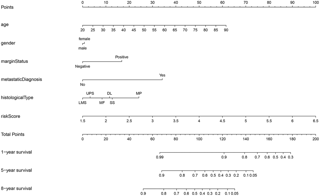 Univariate and multivariate Cox analyses indicated that age, margin status, presence of metastasis, and risk score had significant impacts on prognosis (Table 2). In addition to these four factors, sex and histological type were used to construct the nomogram for STS patients displayed in Figure 6. Internal validation showed that the predictive accuracy for STS as calculated using the C-index was 0.782. Actual survival rates and predictions obtained using the nomogram were largely concordant (Supplementary Figure 9A–9C).