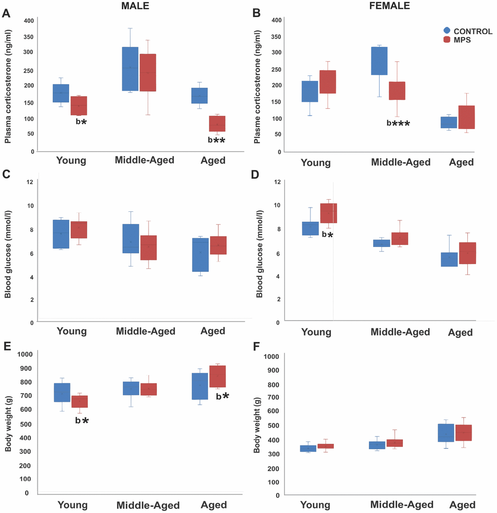 These F4 generation offspring were tested at 6 (young), 12 (middle-aged) and 18 (aged) months of age (Figure 7). One subgroup of F4 offspring (young [males: n=20 (CONTROL=10, MPS=10); females: n=18: (CONTROL=10, MPS=9] underwent behavioural testing in open field, forced swim task and ladder rung walking task (Figure 7B) and blood collection at 6 months of age. They were then euthanized for fresh tissue and urine collections. A second subgroup of F4 offspring was left undisturbed with only weekly weighing and cage changes up to 12 months or middle-aged [males: n=22 (CONTROL=10, MPS=12); females: n=28 (CONTROL=14, MPS=14)]. At 12 months and 18 months of age these F4 offspring underwent behavioural assessments in open field, forced swim task and ladder rung walking task and blood collection (Figure 7B). Glucose levels and plasma corticosterone levels were determined at each time point and animals were weighed weekly.