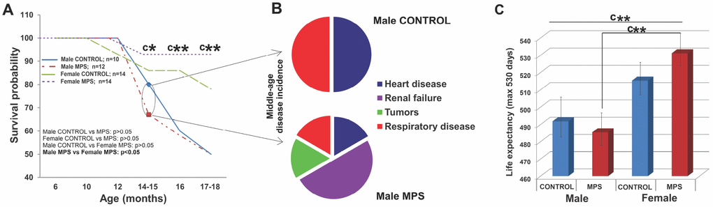 Health status and outcomes including morbidity and mortality were monitored across the lifespan (0-18 months of age) and incidental mortality (before 18-month experimental endpoint) was recorded. MPS animals showed sex-specific survival probability in midlife. MPS males were 33% more likely to die by the age of 14 months, compared to 7% of MPS females (Figure 3A). Premature mortality in middle-aged MPS males was linked to multiple pathologies, including renal failure (2/12) (Figure 3B), heart disease (1/12), respiratory disease (1/12) or tumors (1/12). By contrast, in CONTROL males (n=10) premature death was induced by sudden heart attack (1/10) or respiratory disease (1/10; Figure 3B). In females (n=28) all premature deaths were due to renal failure, affecting one MPS (1/14) and two CONTROL females (2/14).