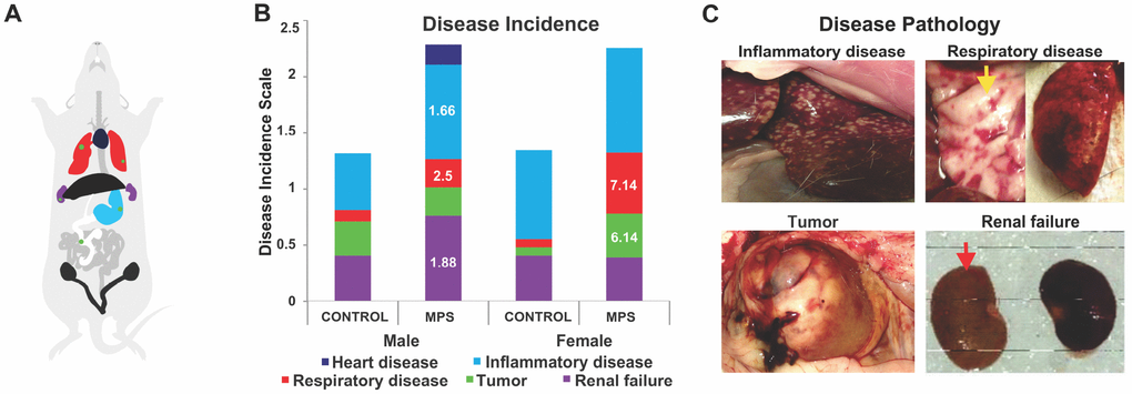 Disease incidence and disease pathologies were recorded after the institutional veterinarian confirmed diagnosis of post-mortem organs and tissues. Relative risk analyses of disease incidence demonstrated increased risk for inflammatory, renal and respiratory disease (Figure 4A) in MPS males and a higher risk of respiratory disease and tumours in MPS females. MPS males were 1.66 times more likely to suffer from inflammatory disease (CI: 0.85-3.25; Figure 4B, 4C) and 1.88 times more likely to have renal failure (CI: 0.82-4.28; Figure 4B) than CONTROL animals. The risk of respiratory disease was 2.5 higher in MPS than CONTROL males (CI: 0.305-20.4; Figure 4B). The risk of respiratory illness and tumors were 7.14 (CI: 1.10-49.6; Figure 4B, 4C), and 6.14 (RR=6.14; CI: 0.825-43.5; Figure 4B, 4C) times higher among MPS females than CONTROL females; respectively. Thus, MPS increased the sex-specific risk of disease across the lifespan.