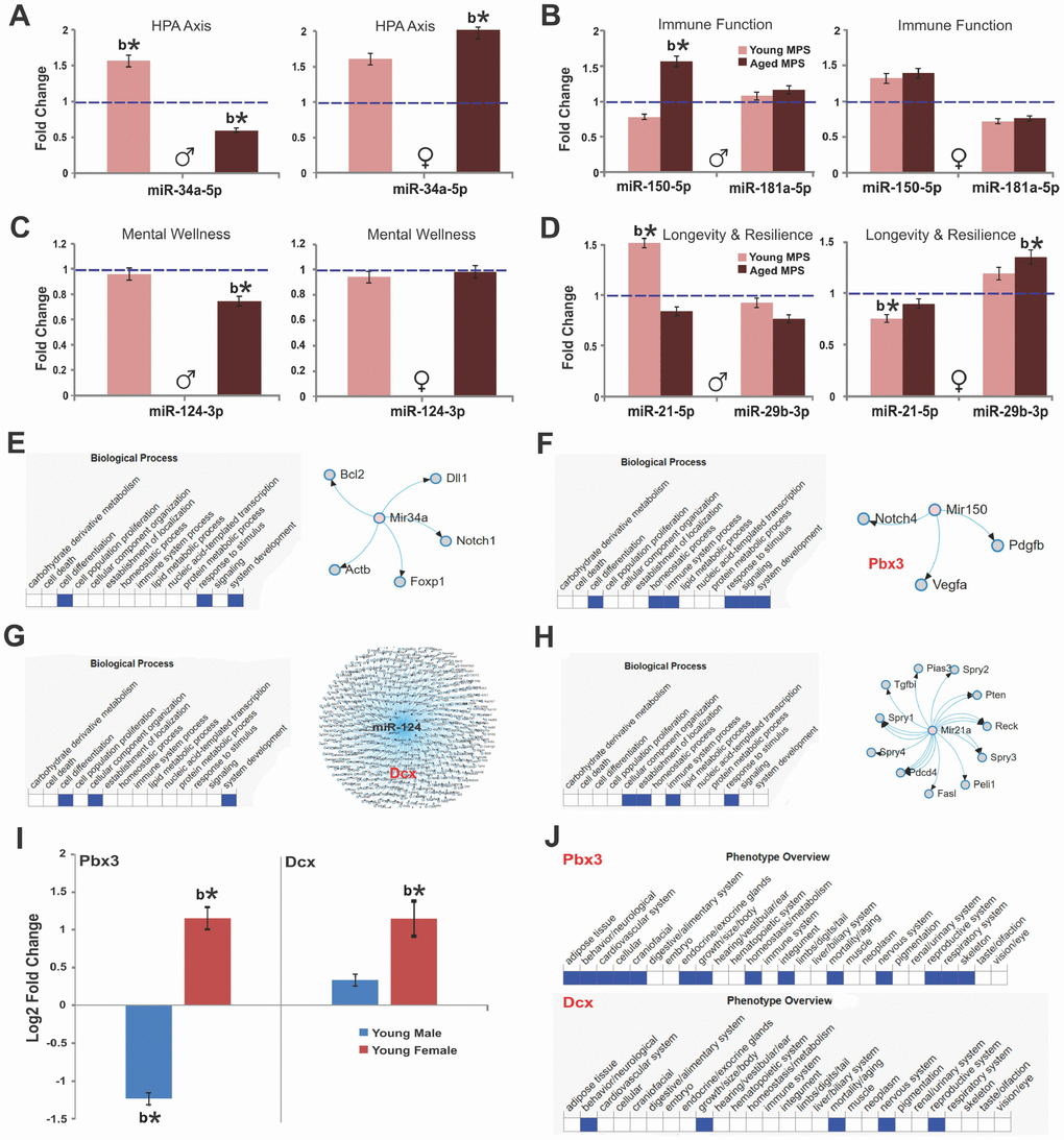 More profound alterations were observed at old age. MPS in males downregulated miR-34a-5p (FDR p<0.05; Figure 5A) and miR-124-3p (FDR p<0.05; Figure 5C) and upregulated miR-150-5p (FRD p<0.05; Figure 5B). In females, MPS upregulated miR-29b-3p and miR-34a-5p (FDR p<0.05; Figure 5) and slightly downregulated miR-21-5p and miR-181a-5p (p>0.05; Figure 5B, 5D). Figure 5E summarizes the putative target genes of miR-34a emphasizing its role in growth factor signaling and brain development through bcl2 and notch1 regulation [48]. MPS upregulated expression of miR-150 and downregulated its target gene pre-B cell leukemia homeobox 3 ([53, 54]; pbx3; Figure 5F, 5I) in young males (FDR p<0.05) and downregulated pbx3 in young females (FDR p<0.05). MPS upregulated miR-124 targeting the doublecortin (dcx) gene and various others in young males and females (FDR p<0.05; Figure 5G, 5I). Finally, the senescence/longevity marker miR-21a interacts with cell signaling and immunity pathways ([52, 55, 56]; Figure 5H). These changes link MPS experiences to brain development and resilience as dcx regulates microtubule-based vesicle transport (Figure 5J), a process critical to both neuronal migration and axonal outgrowth [57]. These data show that MPS via homeostatic regulation accelerates aging and senescence in males and enables lifetime resilience in females.