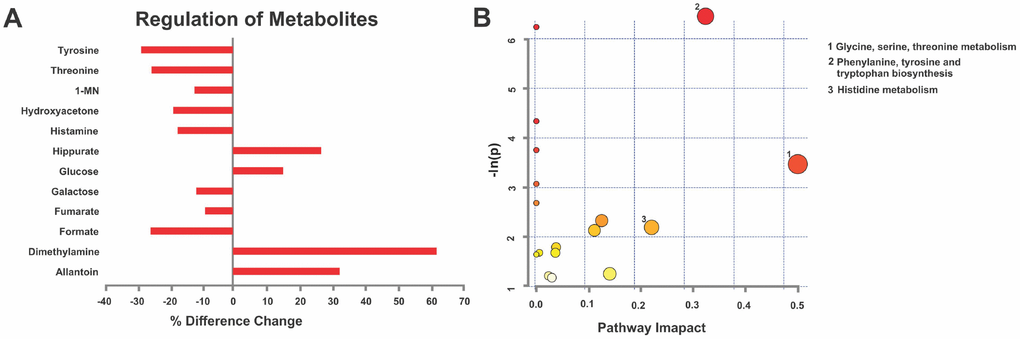 For early prediction and prevention, it is important to identify cellular pathogenic pathways prior to disease onset. Thus, post-mortem urine was collected via bladder puncture from young (6 months) male and female rats. Following 1H NMR spectroscopy [24] the data were exported to undergo Variable Importance Analysis based on random Variable Combination (VIAVC) for metabolite identification and KEGG pathways analysis. MPS in young males resulted in unique metabolic profiles when compared with CONTROLs, including 12 metabolites associated with immune regulation and senescence, such as dimethylamine, hippurate, histamine and threonine (p<0.05; Figure 6A). MPS reduced eight and elevated four metabolites (Figure 6A). Pathway topology analysis found multiple metabolic pathways predicted health trajectories in a genome-scale network model of rat metabolism (Table 1). MPS in young males modified phenylalanine, tyrosine and tryptophan biosynthesis (p<0.05), glycine, serine and threonine (p<0.001) and histidine (p>0.05; Figure 6B) metabolisms. Thus, MPS altered metabolic pathways potentially linked to disease risk at young age.