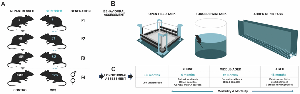 Here, we performed a controlled mixed longitudinal rat cohort study to examine the impact of recurrent stress reaching back across four generations (F0-F3) on lifetime health trajectories. We hypothesized that MPS in the F4 generation would lead to a behavioural phenotype of sex-specific stress vulnerability and resilience at young and old age. Moreover, we proposed particular vulnerability to NCDs in old age in association with up-stream epigenetic and down-stream metabolic biomarker signatures. The findings show that aging and MPS synergistically disturb the stress response and accelerate age-associated morbidity and mortality with sex-specific NCD incidence. By focusing on miRNAs as clinically valid and robust biomarkers [38–41] of aging, the present findings also address an urgent need to identify potentially pathogenic pathways underlying NCDs for early prediction and prevention in precision medicine approaches [42–45].