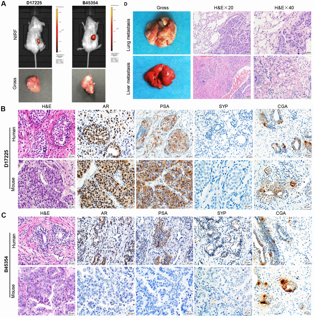 Fresh surgical PC specimens, from a patient with CRPC (B45354) and from another with HNPC (D17225) were used to establish two PC PDX models with differing androgen sensitivities. The tumor specimens were implanted into the renal capsule of male immune-compromised NPG/Vst (NOD-Prkdc scid Il2rgnull) mice and supplemented with testosterone. Initial tumor growth was measured with a near-infrared fluorescence (NIRF) optical imaging system twice weekly using the NIRF heptamethine carbocyanine dye MHI-148. The dye was seen to have preferential uptake in tumor cells but not in normal cells. This can be employed directly for non-invasive dual imaging and for the targeting of agents in human cancers without the need of chemical conjugation [20, 21]. As shown in Figure 1A (top), NIRF signals with strong intensity were obtained in the kidney 3 months after the transplantation of D17225 or B453543 specimens, indicating tumor formation. After euthanizing the mice, tumor nodules were observed (Figure 1A, bottom). Tumors that grew were dissected from the host mice and further passaged subcutaneously into new NPG/Vst male mice. The initial PDX model was established within 3–6 months. We considered three passages to indicate of an established PDX line.