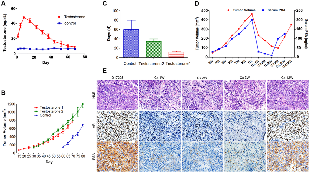 To examine the main factors influencing the establishment of the PC PDX models, tumor tissue from the D17225 PDX model was implanted into mice. The control group was only subcutaneously implanted with the tissue, whereas in the testosterone groups implantation was performed subcutaneously (testosterone 1) or under the renal capsule (testosterone 2) and testosterone was supplemented. The serum testosterone levels in androgen-implanted mice were measured weekly. After one week, the testosterone levels reached a peak and then gradually decreased but remained between 20–60 ng/dl (Figure 2A), significantly higher than that of normal male mice (6.0-7.8 ng/dl). Mice supplemented with androgen displayed faster tumor growth than those in the control group (Figure 2B). The renal capsule transplantation group exhibited significantly shortened growth latency (from the first day of transplantation to the time of tumor growth to 100 mm3) (Figure 2C).