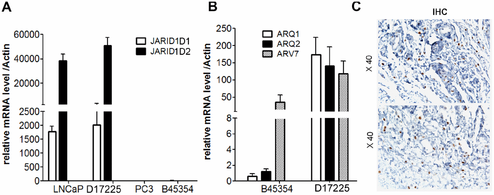 To ensure the originality and maintenance of the genotypes of the PDX models, we performed STR analyses, and demonstrated distinct STRs in each model. The 16 STR loci of tumor tissues derived from PDX models were confirmed to be identical to the loci from the patient tumor tissue (Table 2). Further analysis demonstrated the loss of JARID1D expression in the tumor tissue from the B45354 PDX, which was similar to the pattern observed in the PC cell line, PC-3 (Figure 3A). This gene—located on the Y chromosome—is a prognostic marker and suppressor of prostatic tumor invasion and metastasis [22, 23]. Polymerase chain reaction (PCR) from B45354 barely amplified the specific AR band, whereas D17225 showed an amplified band and the fragment size was consistent with that of the AR target fragment after sequencing. The expression of AR, as determined by reverse transcription (RT)-PCR analysis was consistent with the results of IHC. In addition, although AR expression was nearly negative in B45354 tumor tissues, an increase in the levels of the androgen receptor variant 7 (ARV7) was detected in the PDX tissue by RT-PCR, but weak positive expression was detected by IHC (Figure 3B and 3C).
