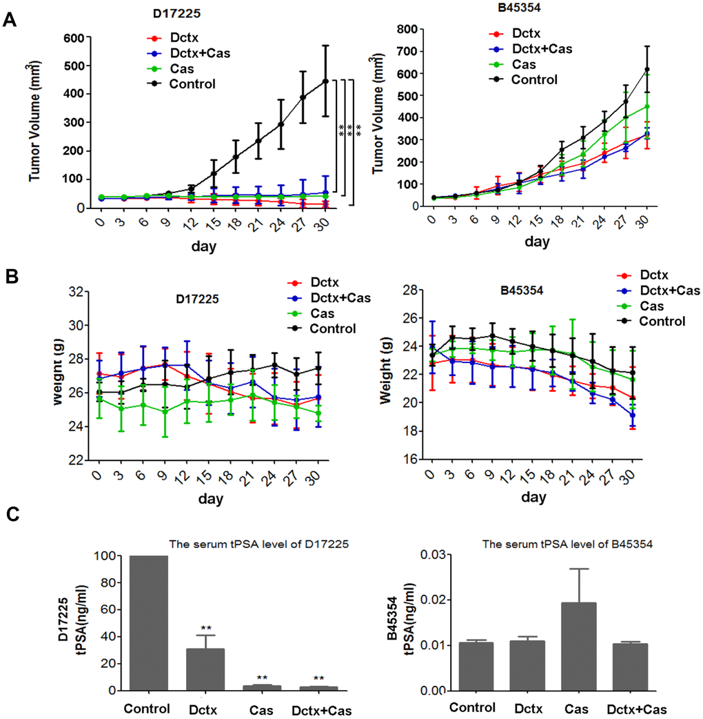 Because ADT is the first-line therapy for advanced PC and docetaxel was the first therapeutic agent shown to extend survival in men with metastatic CRPC [3], we evaluated the responses of different PDX models to castration, docetaxel and combination of the two. The therapeutic effect was assessed by examining changes in the tumor volume and body weight of tumor-bearing mice. As shown in Figure 4A, in the D17225 PDX model, docetaxel (Dctx), Castration (Cas) or the combined castration + docetaxel (Dctx+Cas) treatment significantly inhibited tumor growth (P < 0.01 compared to controls). In the B45354 PDX model, although docetaxel also inhibited tumor growth, there was no significant difference with respect to the control group, and both castration + docetaxel and docetaxel treatments resulted in significant loss in the body weight of the mice (Figure 4B).