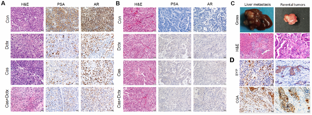 We also evaluated the therapeutic effect by observing the changes in histological morphology with H&E staining (Figure 5). In the D17225 model, the tumor cells were abundant and varied in size, and the morphology of the nucleus was variable. After castration or docetaxel treatment, the number of tumor cells decreased and the matrix component increased. After castration + docetaxel treatment, the number of tumor cells decreased gradually and did not exhibit typical characteristics (Figure 5A). In the B45354 model, the different treatments did not alter the structure of the tumor tissue significantly (Figure 5B). The model even displayed liver metastasis after treatment with docetaxel (Figure 5C) with metastatic percentage reaching 30%. Moreover, the treatment of B45354 PDXs with castration + docetaxel induced the expression of the neuroendocrine markers CGA and CYP at high levels, thus displaying a feature of neuroendocrine carcinoma (Figure 5D).