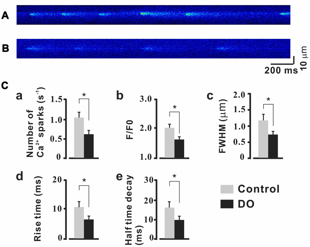 STOCs were fund to have been derived based upon both RyRs and BK channels and RyR expression was found to have been significantly decreased in DO smooth muscle [16], Thus, it is reasonable to hypothesize that alterations in the dynamics and levels of Ca2+ spark activity may also contribute to decreased STOCs. Already, such a finding has been noted in similar studies on cerebral artery smooth muscle cell [21, 22]. We thus tested measures of the properties of Ca2+ spark in detrusor myocytes. To record measures for Ca2+ sparks, we clamped the myocytes of control and DO detrusors at -40 mV. Examples of individual Ca2+ sparks were determined in high resolution and a summary of the properties of the resultant identified Ca2+ sparks are presented in Figure 2. As can be seen in Figure 2C, when compared to the measures for control cells (n/c=6/71), Ca2+ spark frequency was found to have decreased significantly in the detrusor myocytes of DO rats (n/c=6/85) (Figure 2Ca, Ctrl vs DO: 1.07 ± 0.15 vs 0.62 ± 0.11 s-1). Similarly, F/F0 (Figure 2Cb, Ctrl vs DO: 2.01 ± 0.12 vs 1.60 ± 0.10), FWHM (Figure 2Cc, Ctrl vs DO: 1.17 ± 0.22 vs 0.74 ± 0.11 μm), rise time (Figure 2Cd, Ctrl vs DO: 10.47 ± 1.79 vs 6.37 ± 1.16 ms), and half-time decay (Figure 2Ce, Ctrl vs DO: 16.61 ± 3.05 vs 10.03 ± 2.16 ms) were found to have had measures that were significantly reduced in DO cells. These data suggested that altered Ca2+ spark activity which existed may have accounted for the decreases in STOCs and increases in spontaneous contractions in DO muscle.