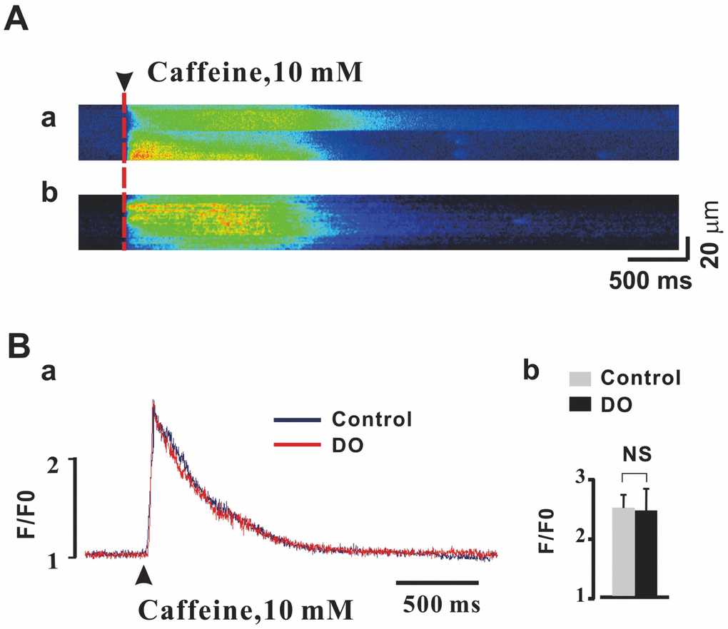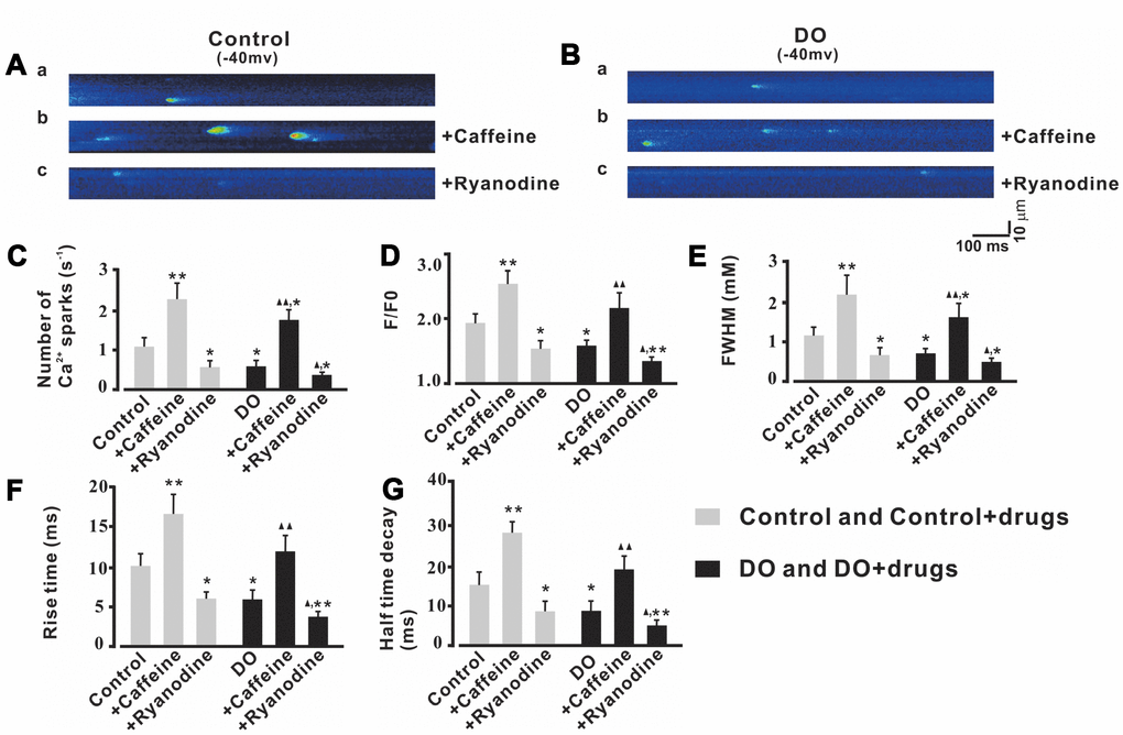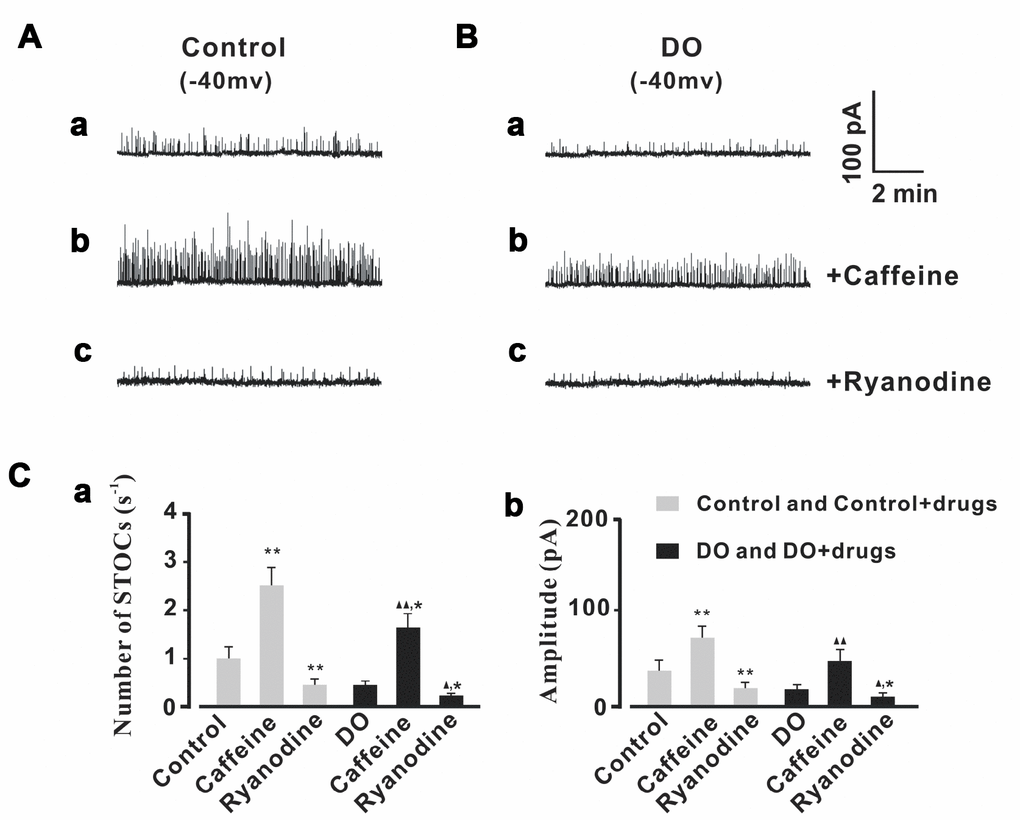 Ca2+ sparks and STOCs were remarkably increased by caffeine and attenuated by ryanodine in both control and DO myocytes