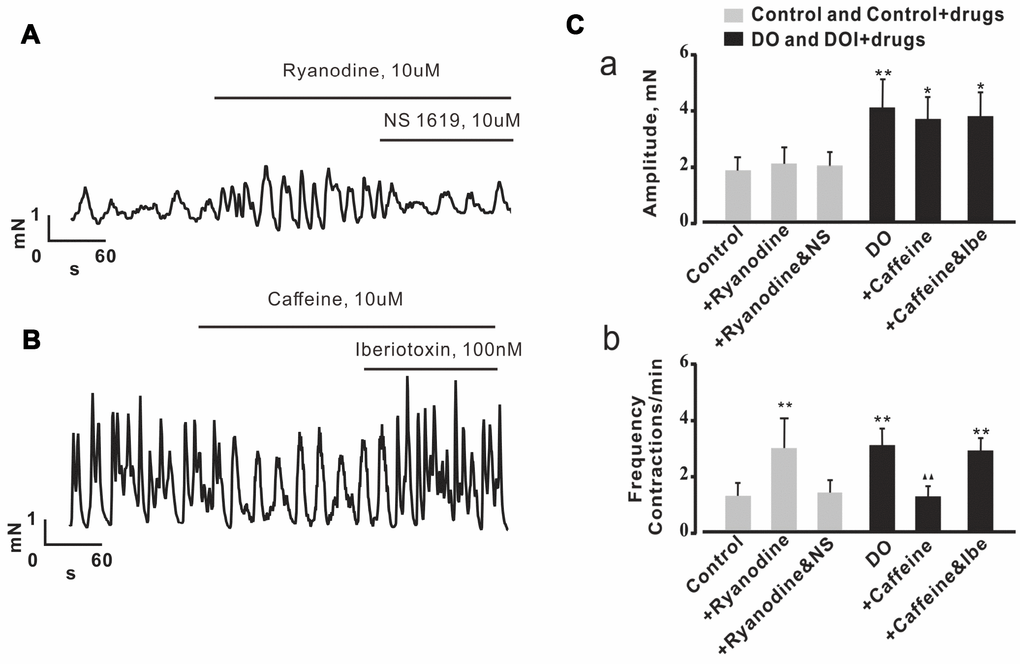 In the detrusor strip experiments, we used Ca2+ spark regulators to investigate whether or not decreased measures of Ca2+ spark activity contributed to increased spontaneous contractions in DO muscle. Consistent with the results from our own similarly oriented previous research [16], ryanodine was found to have significantly increased measures of the frequency of spontaneous contractions derived from control detrusor strips (Figure 6A, Figure 6Cb). Interestingly, the effect of ryanodine on detrusor contractions was abolished by way of application of the BK channel activator, NS1619 (10 μM) (Figure 6A, Figure 6Cb) (n/c=6/21). We then next explored measures of the effects of caffeine on data for spontaneous contractions derived from DO detrusor strips. In our results for this assessment using DO bladder strips, we found that the frequency of spontaneous contractions was significantly inhibited by 10 μM caffeine (Figure 6B, Figure 6Cb). This result suggested that there was the promotion of Ca2+ spark activity that was induced by caffeine, and that such an application could restore the impairment of negative feedback regulation in DO muscle. Similarly, based upon our results from the use of DO detrusor strips, we found that the effect of caffeine on spontaneous contractions was reversed by application of iberiotoxin (100 nM) which is a BK channel blocker (n/c=6/25) [Amplitude (mN): Ctrl 1.83 ± 0.47, Ctrl + Caffeine 2.04 ± 0.58, Ctrl + Ryanodine 1.97 ± 0.48, DO 4.07 ± 0.98, DO + Caffeine 3.66 ± 0.75, DO + Ryanodine 3.79 ± 0.85; Frequency (Contractions/min): Ctrl 1.22 ± 0.45, Ctrl + Caffeine 2.86 ± 1.07, Ctrl + Ryanodine 1.31 ± 0.44, DO 2.98 ± 0.59, DO + Caffeine 1.18 ± 0.36, DO + Ryanodine 2.8 ± 0.42].