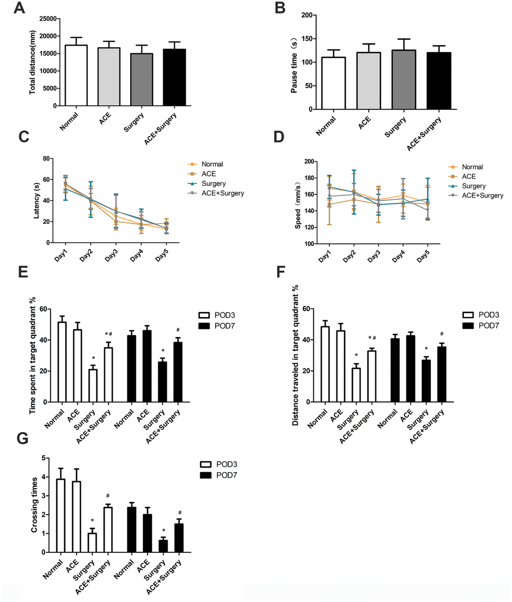 Then, we evaluated hippocampus-dependent memory performance via the Morris water maze (MWM). In the training phase, no significant differences were found among the groups in latency and average speed (Figure 1C and 1D), indicating that all the mice had learned to find the hidden platform after five days of training. In the probe trial, the percentage of time spent in the target quadrant, the distance traveled in the target quadrant and the number of platform crossings were all notably lower in the surgery group than in the normal group on POD 3 and POD 7, signifying that the surgery had evoked cognitive deficits (which were not due to spontaneous locomotor activity decline, as evidenced by the OFT results). These indicators were greater in the acetate + surgery group than in the surgery group on both POD 3 and POD 7 (Figure 1E–1G), indicating that acetate may have prevented surgery-induced cognitive impairment.
