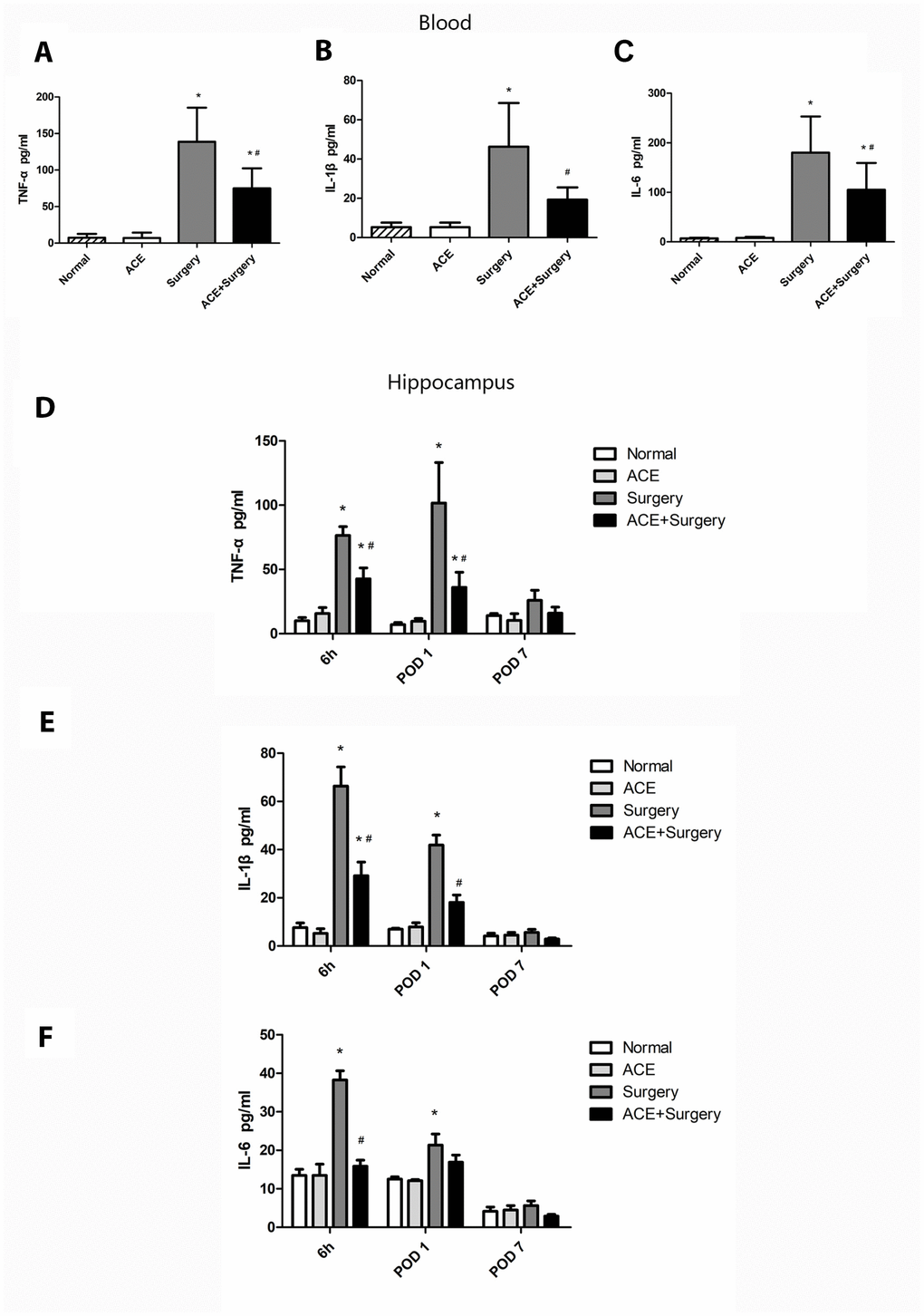 We then assessed the acute inflammatory response in the plasma and the hippocampus after surgery. The peripheral blood levels of TNF-α, IL-1β and IL-6 were upregulated 6 h post-surgery, but acetate markedly reduced the levels of these inflammatory proteins (Figure 2A–2C). Similar results were observed for neuroinflammation: acetate dramatically downregulated inflammatory factors in the hippocampus 6 h post-surgery. On POD 1, hippocampal inflammatory cytokine levels were significantly greater in the surgery group than in the normal group. Acetate treatment attenuated the hippocampal expression of IL-1β and TNF-α, but not IL-6, on POD 1 (Figure 2D–2F). On POD 7, cytokine expression did not differ significantly between the surgery group and the normal or acetate groups, suggesting that the inflammation had diminished over time. These results indicated that acetate pretreatment may have suppressed the systemic inflammation and neuroinflammation induced by surgery.