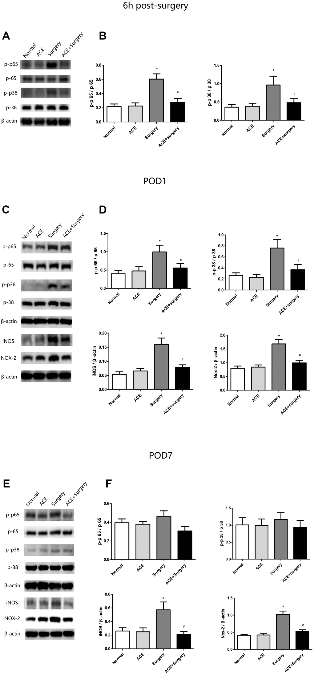 In addition, inflammation is known to increase the production of ROS and RNS, which further exacerbate inflammatory states. Thus, we measured the expression of NOX2 and inducible nitric oxide synthase (iNOS) through Western blot analysis. Surgery increased NOX2 and iNOS expression, while acetate inhibited surgery-induced oxidative stress by reducing the levels of these proteins on both POD 1 and POD 7 (Figure 3).