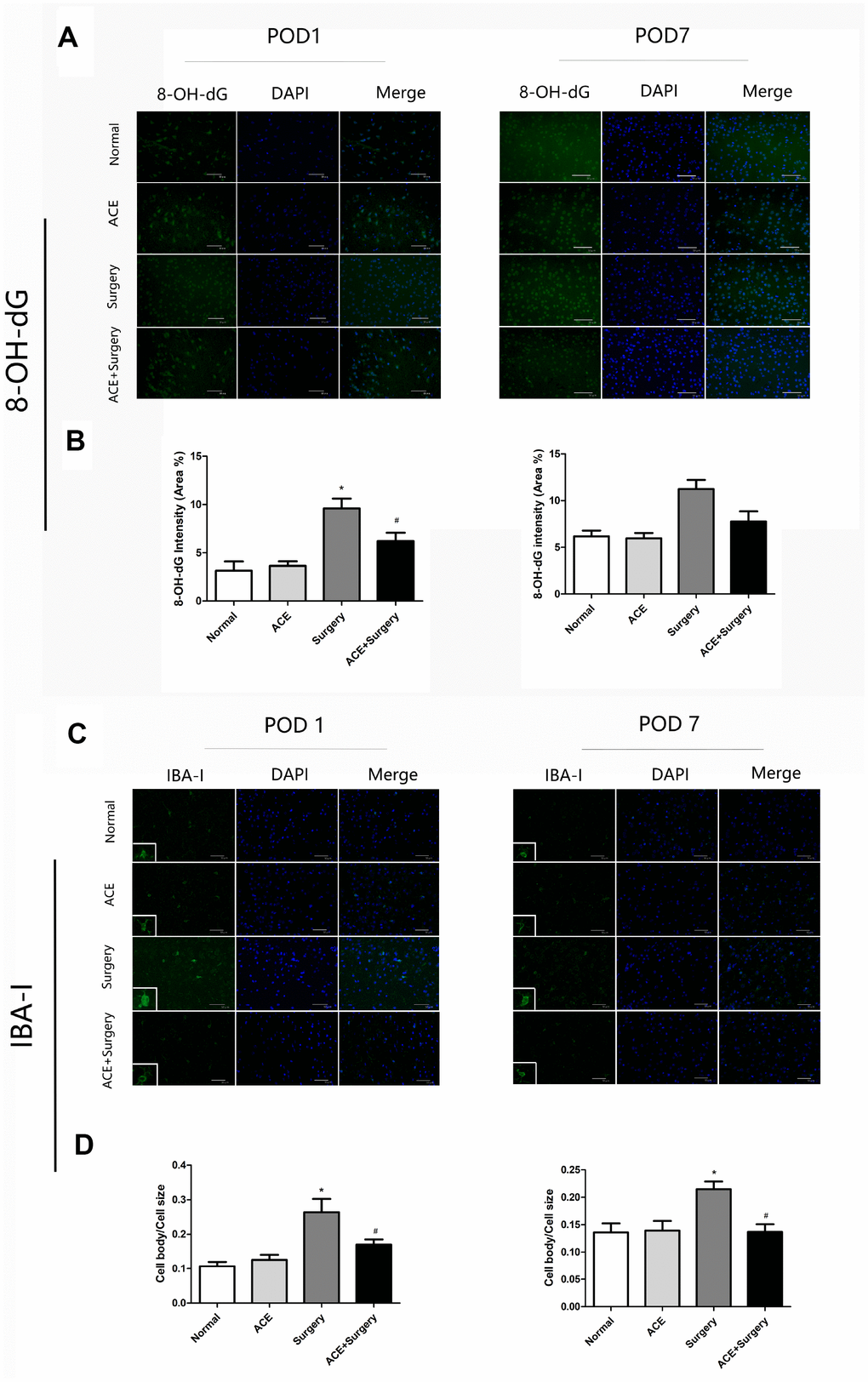 Surgery-induced ROS generation was also measured by 8-hydroxy-20-deoxyguanosine (8-OH-dG) immunostaining, which detects oxidized nucleic acids resulting from cellular ROS damage [22] and has been used as a marker of DNA oxidation. The data revealed that surgery induced ROS overproduction in the hippocampus, while acetate treatment clearly attenuated ROS production on POD 1. Thus, acetate may function as an antioxidant. However, there were no significant differences on POD 7 (Figure 4A and 4B).