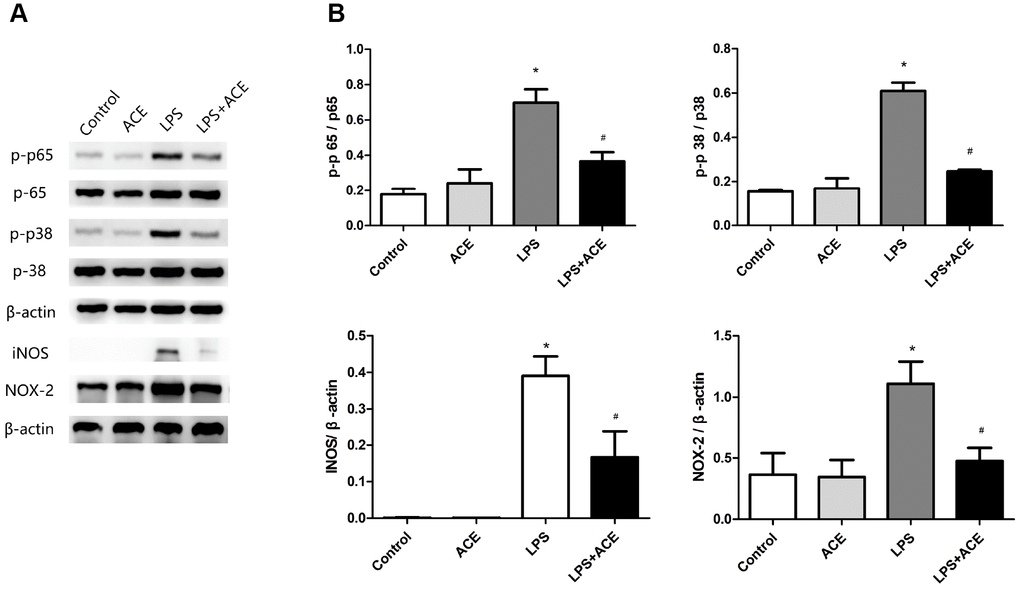 BV2 cells were cultured in 24-well plates for the enzyme-linked immunosorbent assay (ELISA) and in six-well plates for Western blot analysis. The levels of inflammatory proteins were detected by ELISA after the cells had been treated with LPS for 6 h. The protein levels of signaling molecules (p-p38 and p-p65) and oxidative stress factors (iNOS and NOX2) were assessed by Western blotting 1 h and 24 h after LPS treatment. For all in vitro experiments, acetate treatment started 30 min before or after LPS stimulation, so the cells were ultimately treated with acetate for 6.5 h or 5.5 h, respectively.